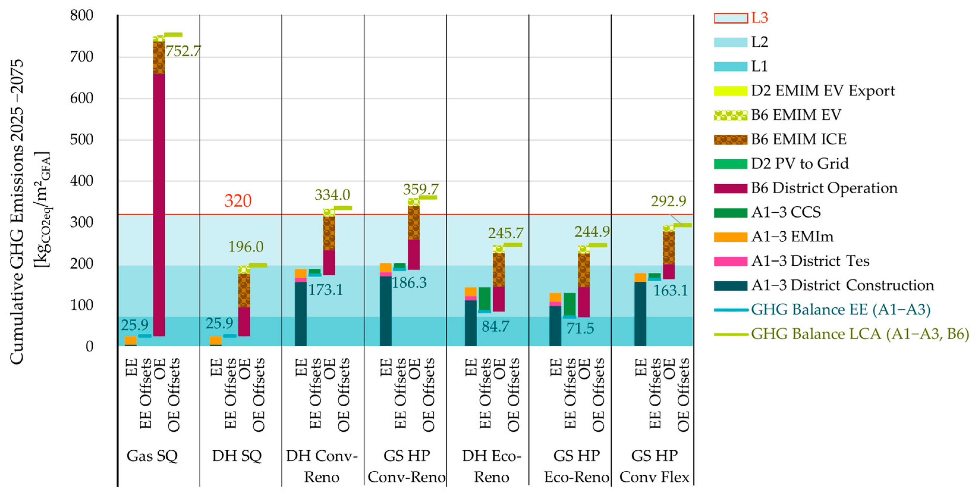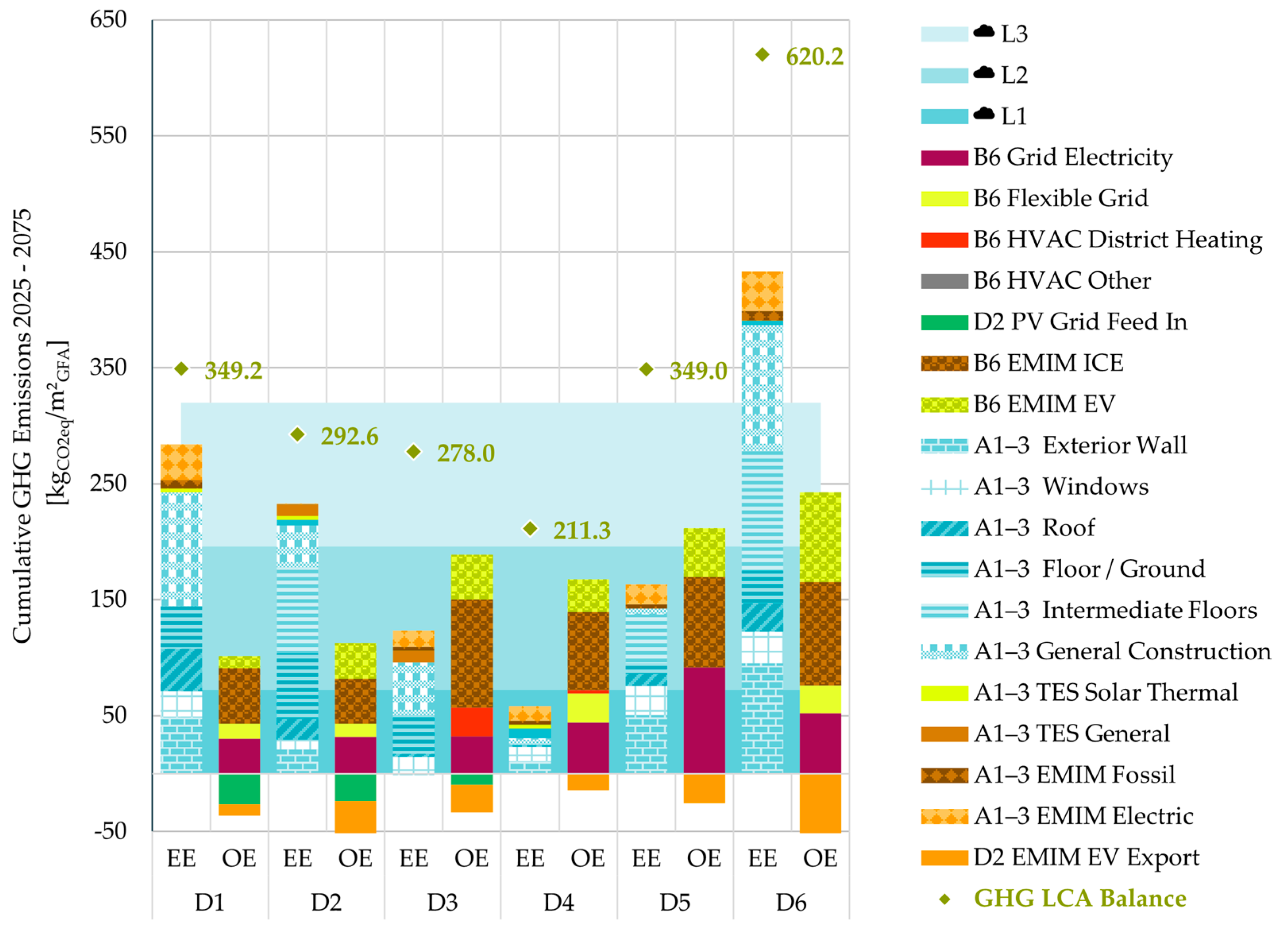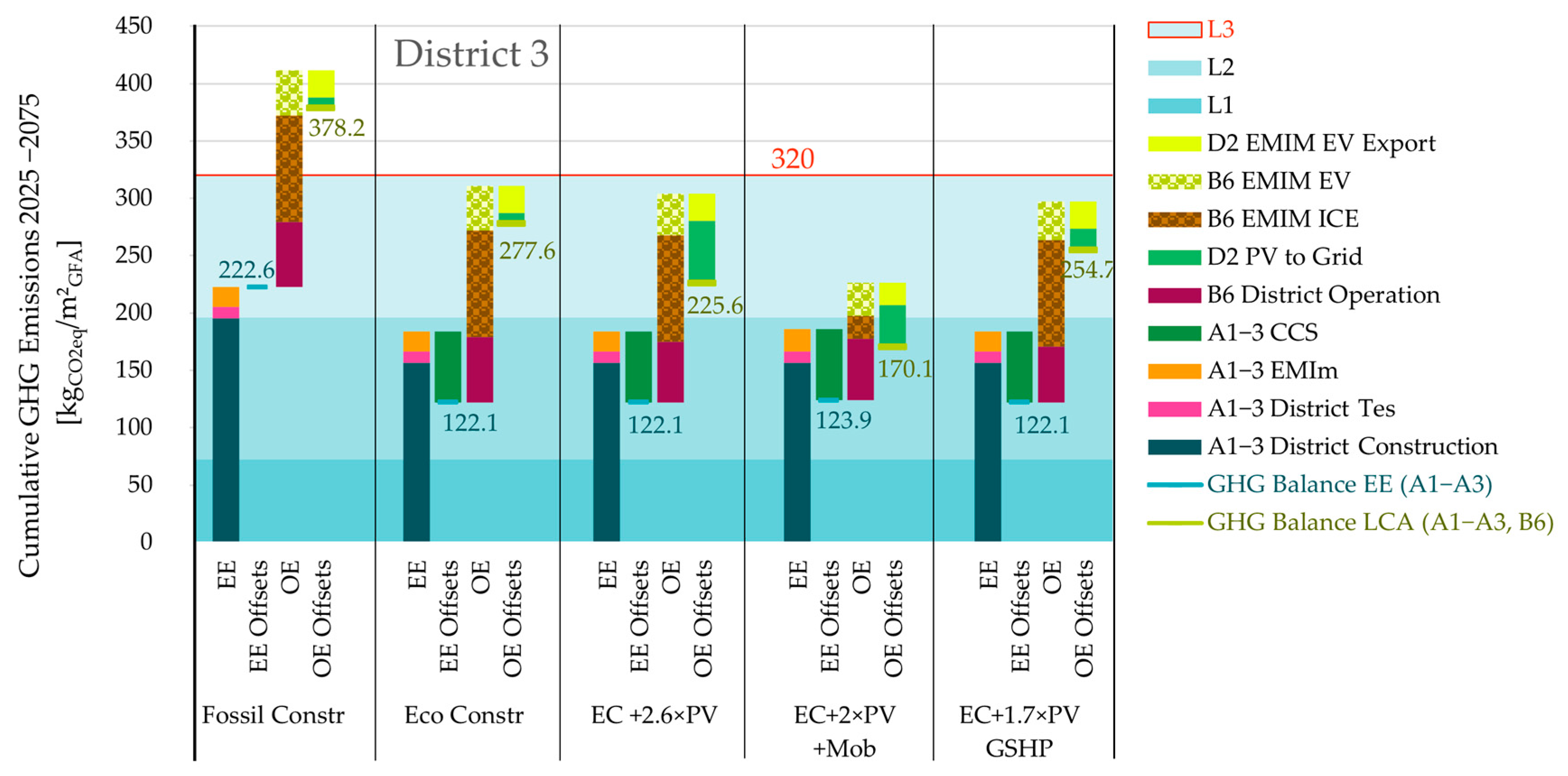 - Cumulative GHG balance (2025–2075, kgCO2e·m−2GFA)—as defined in the framework above: cradle-to-grave embodied emissions (A1–A3; buildings, TES, PV, batteries, vehicles, C1–C4 before 2050), time-resolved operational emissions (B6; grid electricity and thermal carriers), operational mobility (B8 EMIM; ICE/EV), and avoided grid emissions (D2; PV exports and EMIM substitution). Negative components reduce the balance. Compliance bands are L3 = 320, L2 = 196, L1 = 72 kgCO2e·m−2GFA.