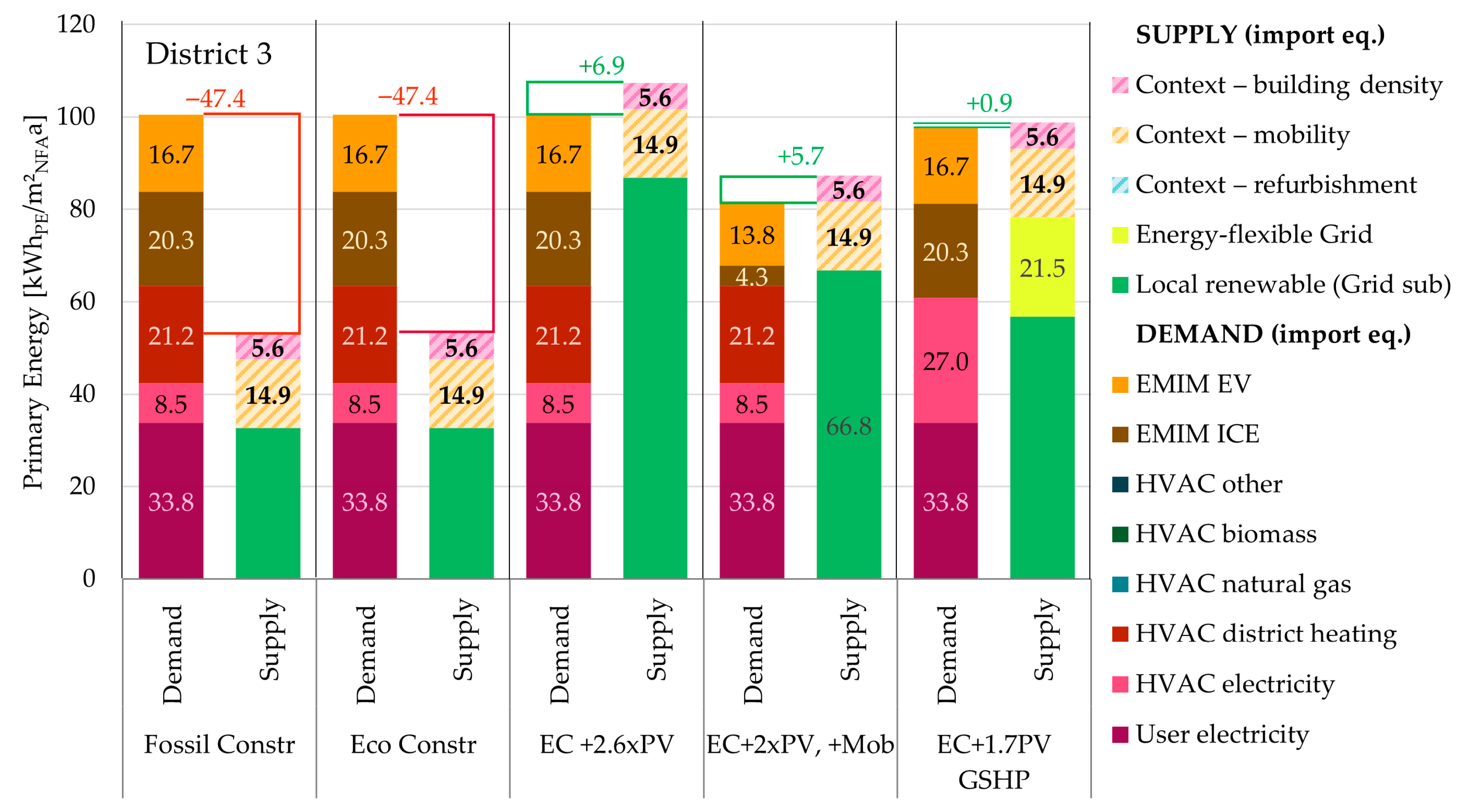 - Primary energy balance (kWhpe·m−2 NFA·a−1)—computed per [24,36] as the difference between annual primary energy grid equivalence from local renewable supply and flexible grid use (PV self-use and feed-in, flexible TES and EMIM operation) and the district’s primary energy demand (grid equivalence, HVAC and electricity; EMIM included or excluded depending on the level). A positive value denotes a “positive balance”. Context factors for density, mobility and renovation may apply as virtual demands or supplies.