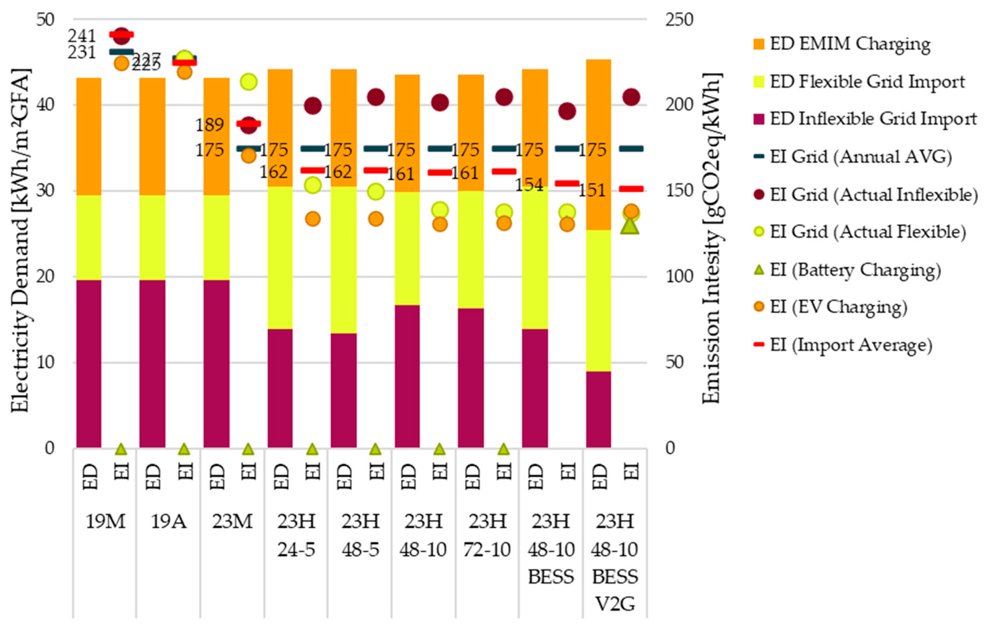 - Hourly emission factors and flexibility (via BESS/V2B/TABS) can significantly reduce operational emissions compared to traditional monthly or annual accounting methods, highlighting the importance of time-resolved emissions in accurate PED assessments.