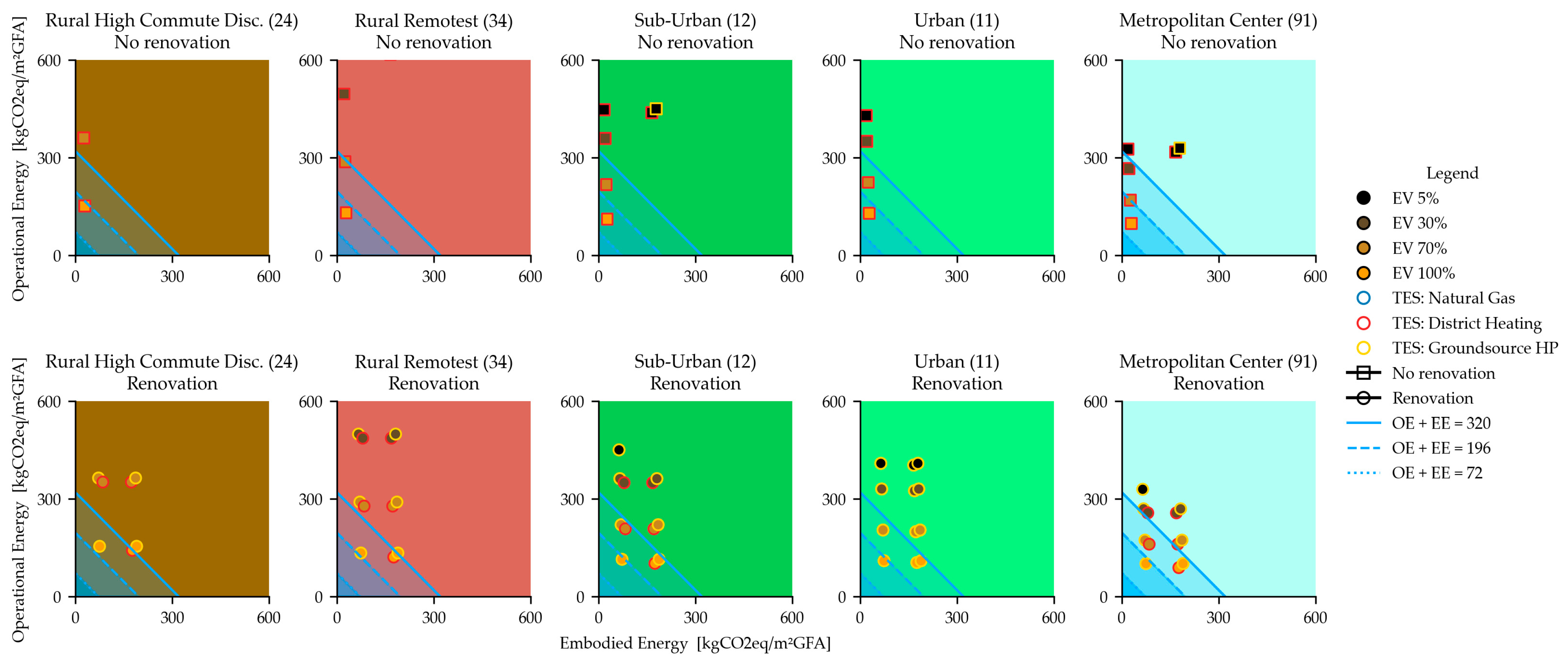 - A diverse set of districts, ranging from low-density residential to high-density urban contexts, can achieve compliance with the proposed carbon budget (L3) by adopting low-carbon construction materials, maximizing renewable energy generation (PV oversizing), and electrifying mobility (e.g., EVs).