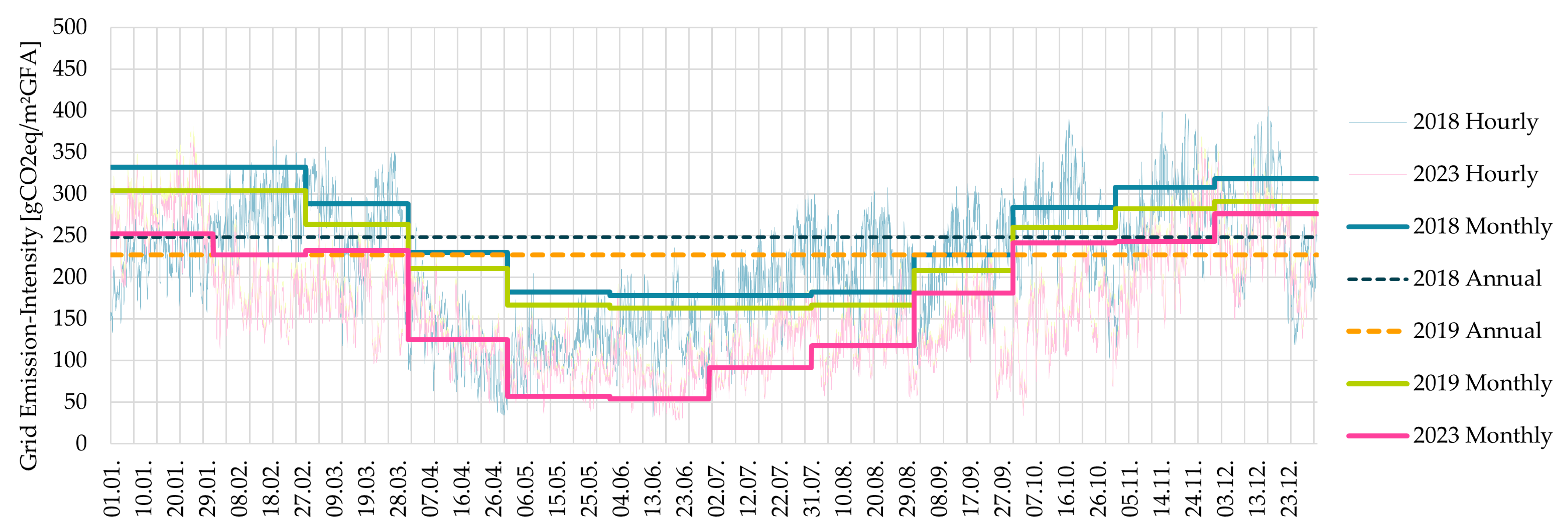 - For practical usability, regulatory consistency, and comparability with the Austrian building code, the official application of this proposed climate neutrality assessment framework for PEDs uses monthly CO2 conversion factors to normalize hourly values to compliant annual levels (Appendix A Table A3). These are linearly downscaled from 2023 to 2050 according to the decarbonization path for each energy carrier (Section 2.5.1).