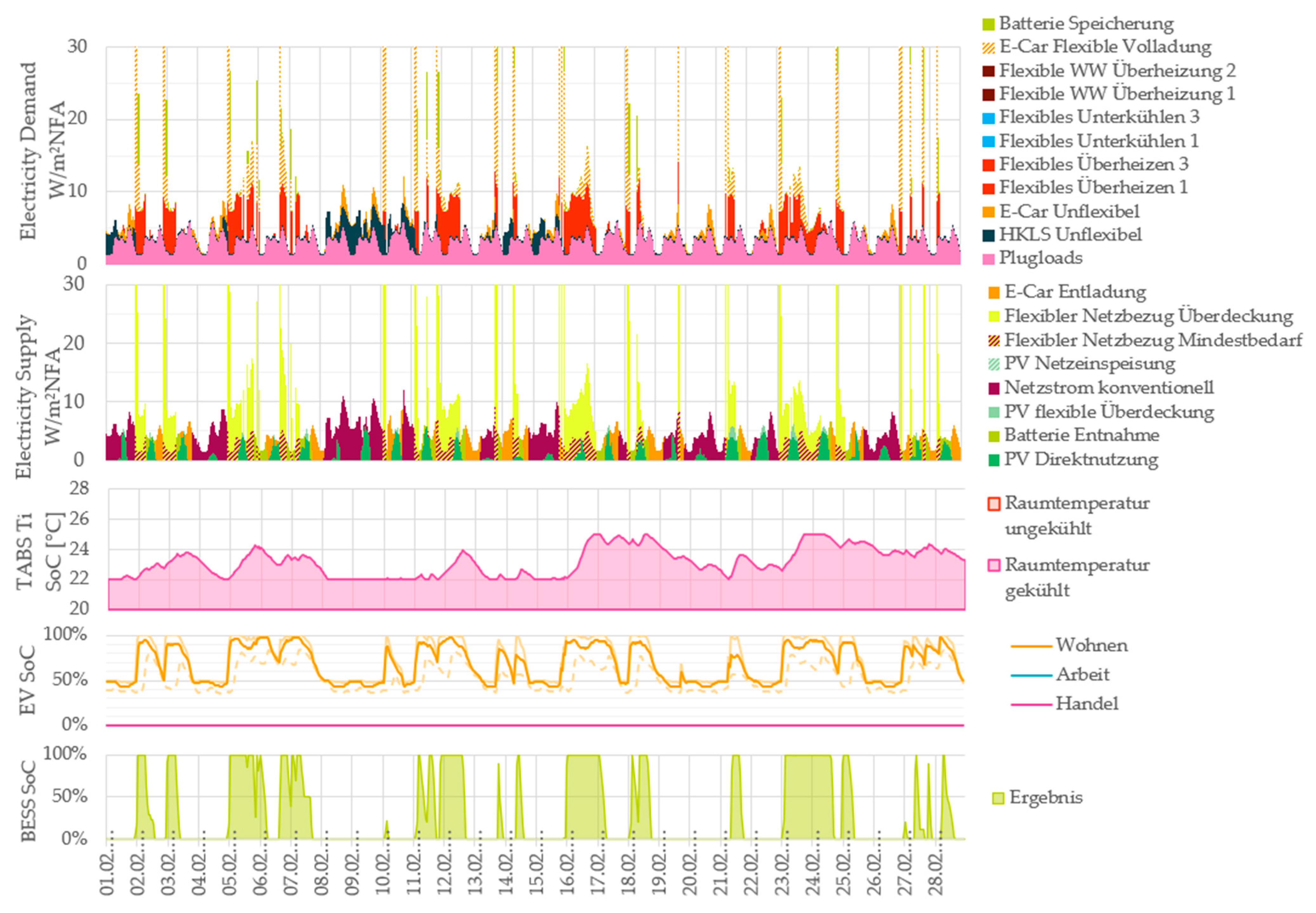 - Design implications. Case study applications show that even highly efficient PED designs can exceed the available CO2 budget unless embodied emissions are minimized (through low-carbon/biogenic options, lean structures), renewable energy and flexibility contributions are maximized (through flexible dispatch with BESS/V2B/TABS), and operational emissions from user-driven mobility are effectively reduced (by electrification and demand reduction). The main findings of the case studies indicate that: