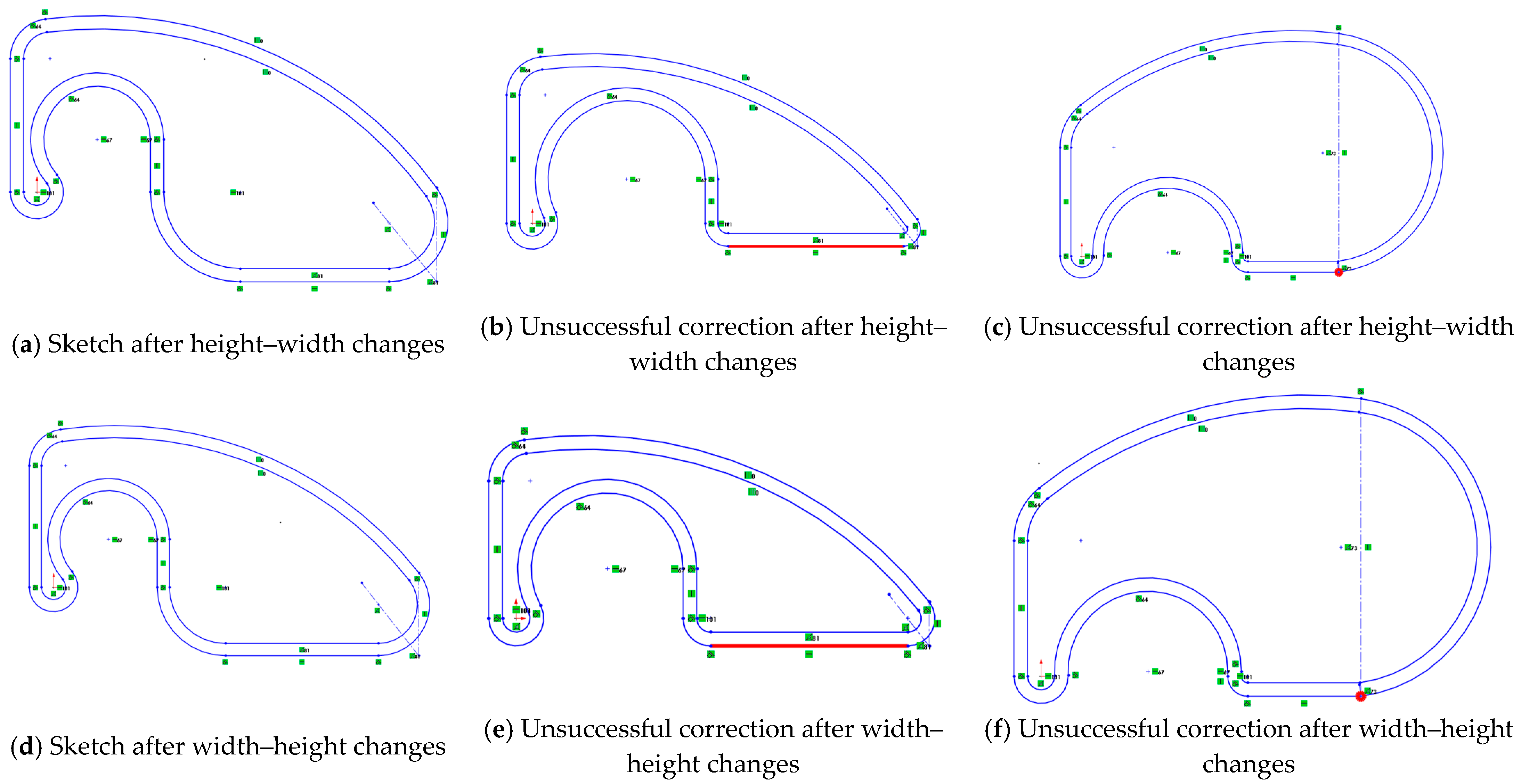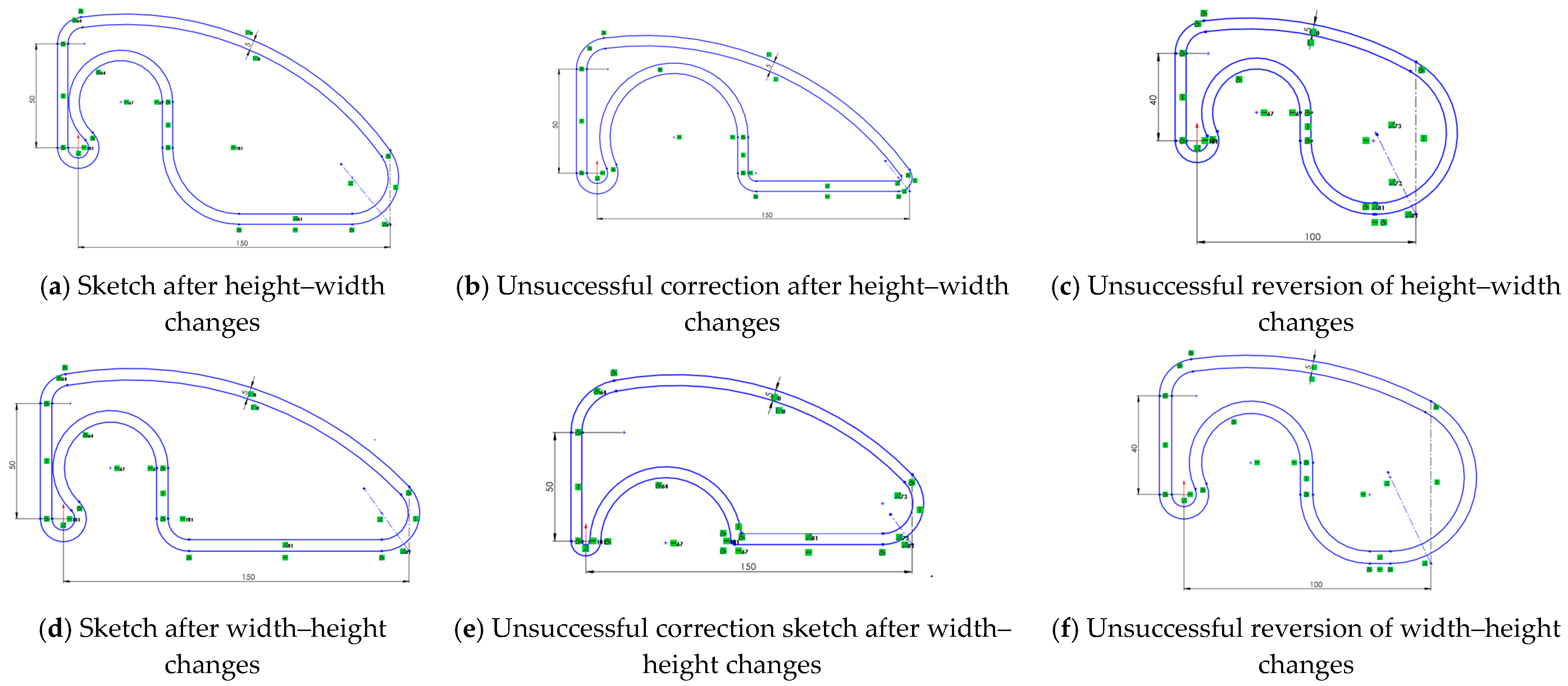 - Moving the lower-strength segment resulted in a new deformed sketch affecting its size (Figure 3b,e). In both cases, a local shrinkage appeared, as if the sketch had been stretched.