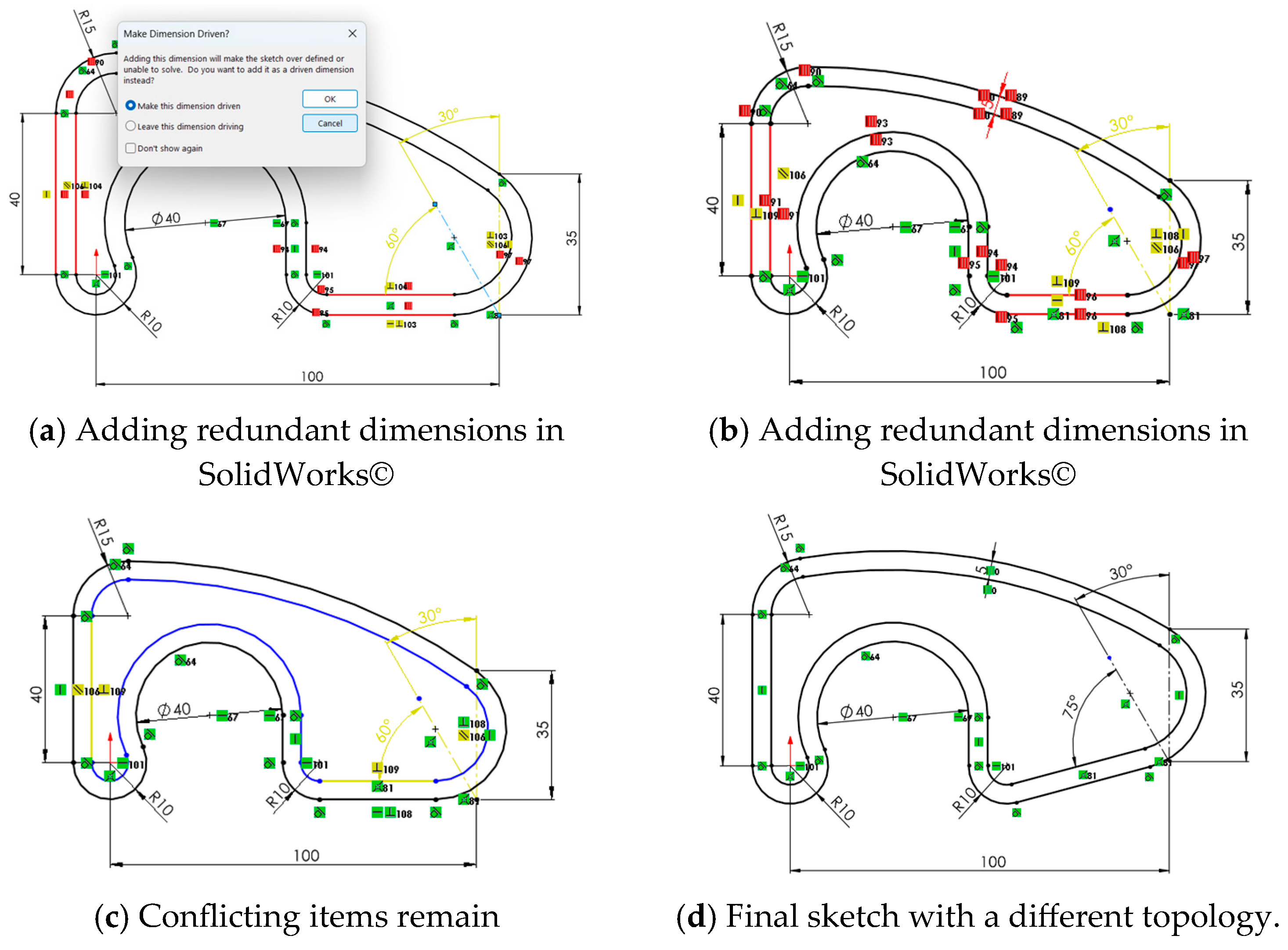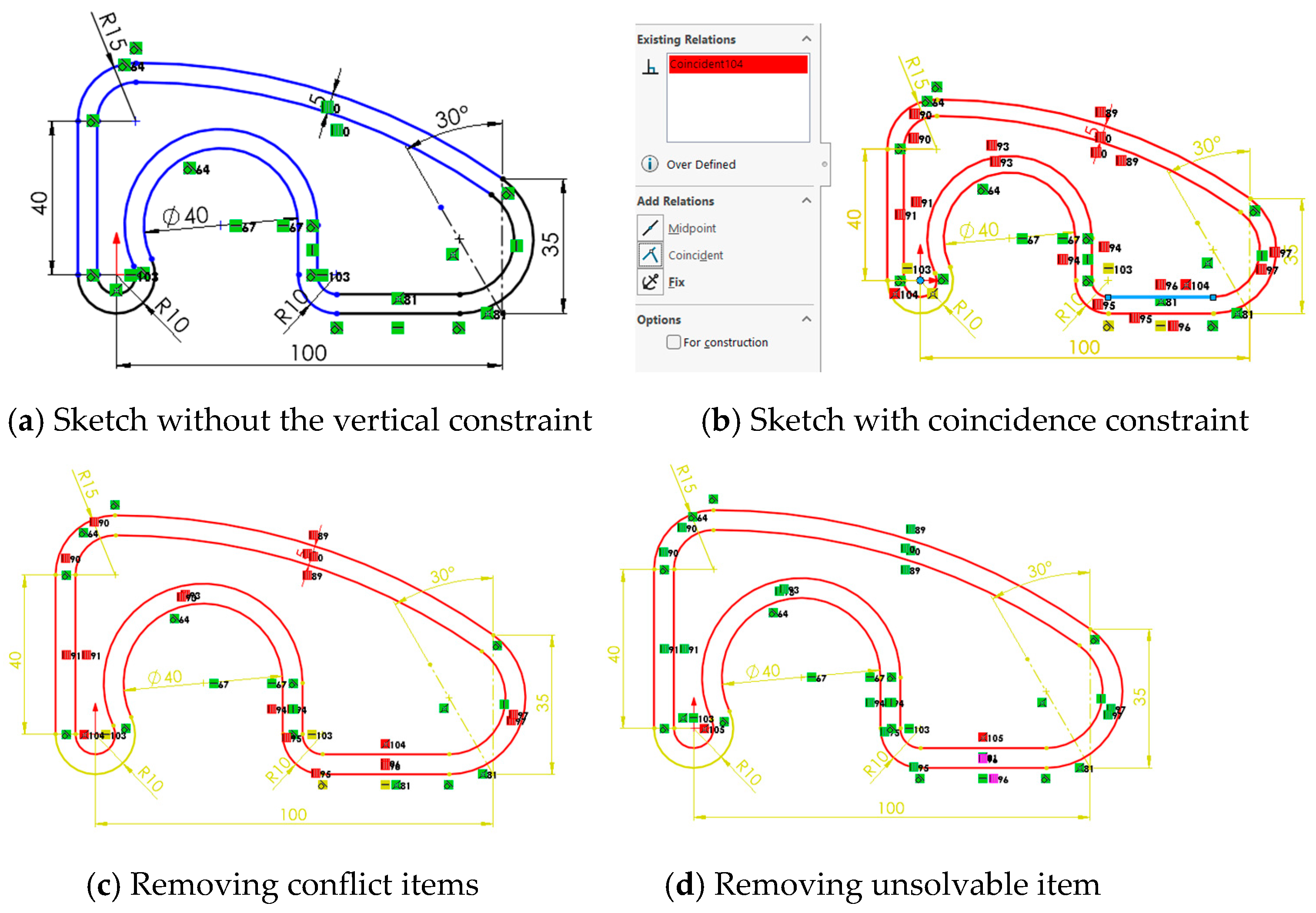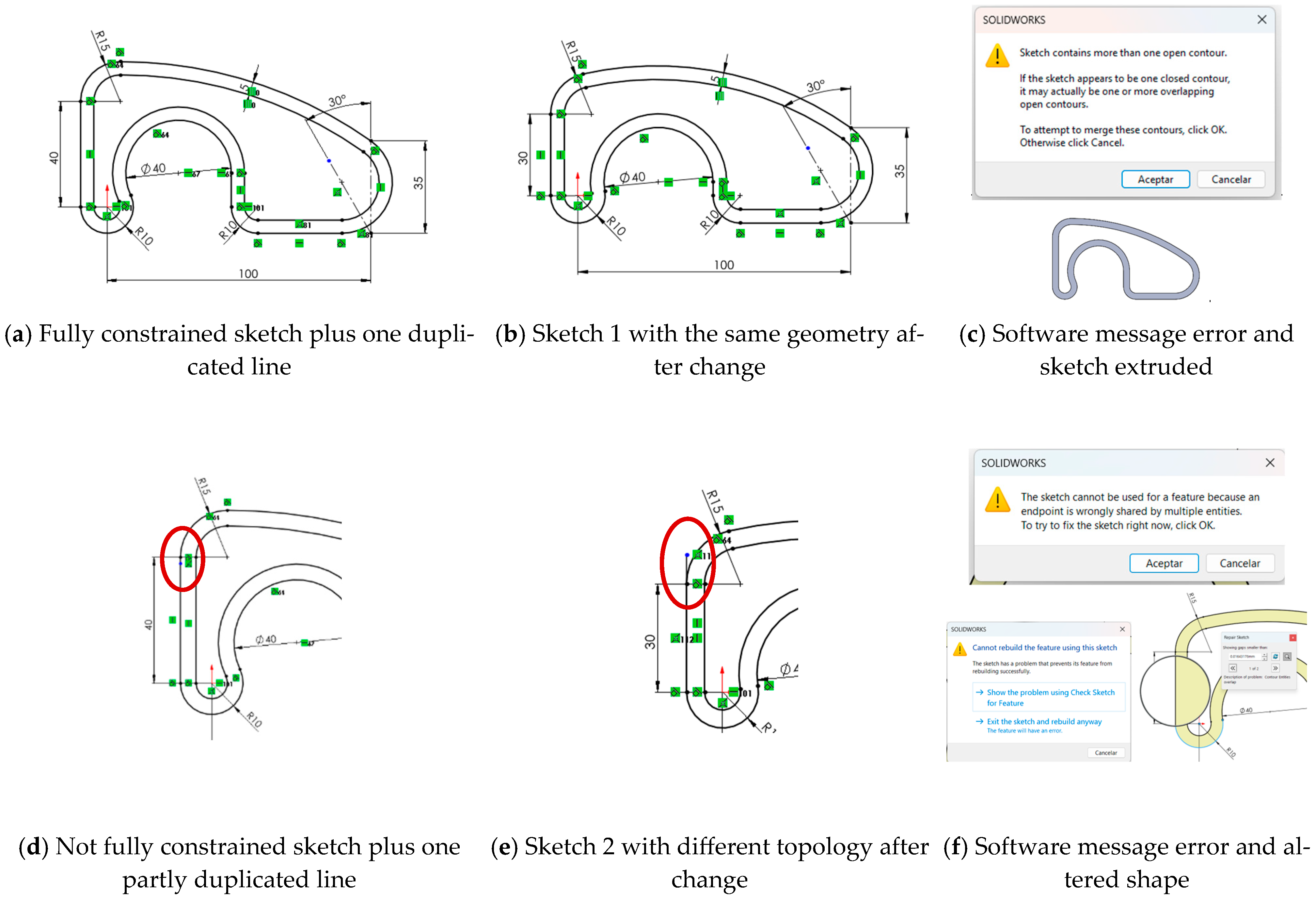 - Case 1. Failure in constraining sketches by overlooking dimensional (continuous) and/or geometric (discrete) constraints. This case demonstrates how the framework can be extended “in cascade” by studying different subcases of poorly constrained sketches selected based on authors’ experience: (1) leaving the entire sketch unconstrained, (2) removing only geometric constraints, (3) removing only dimensional constraints, and (4) removing just some constraints, which may be dimensional, geometric, or some critical.