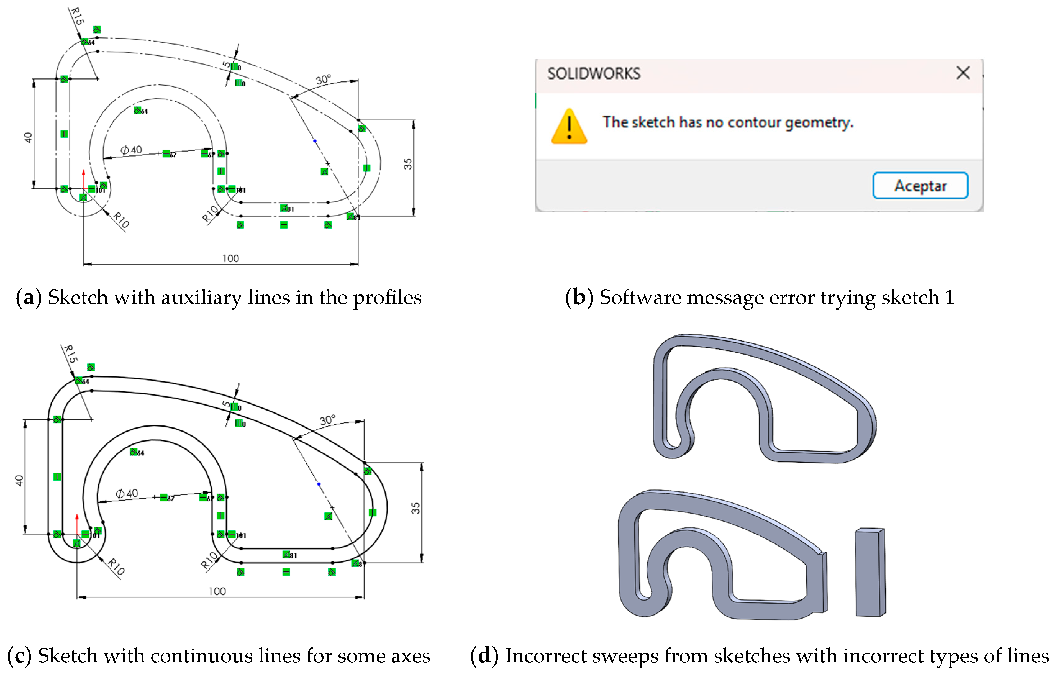 - Software support is inconsistent. Some deficiencies (like open profiles) are flagged without actionable suggestions. Others (such as duplicate lines or axis misclassifications) are not detected at all, which means that relying solely on system warnings is insufficient. Designers must critically interpret software behavior and perform manual checks when necessary.