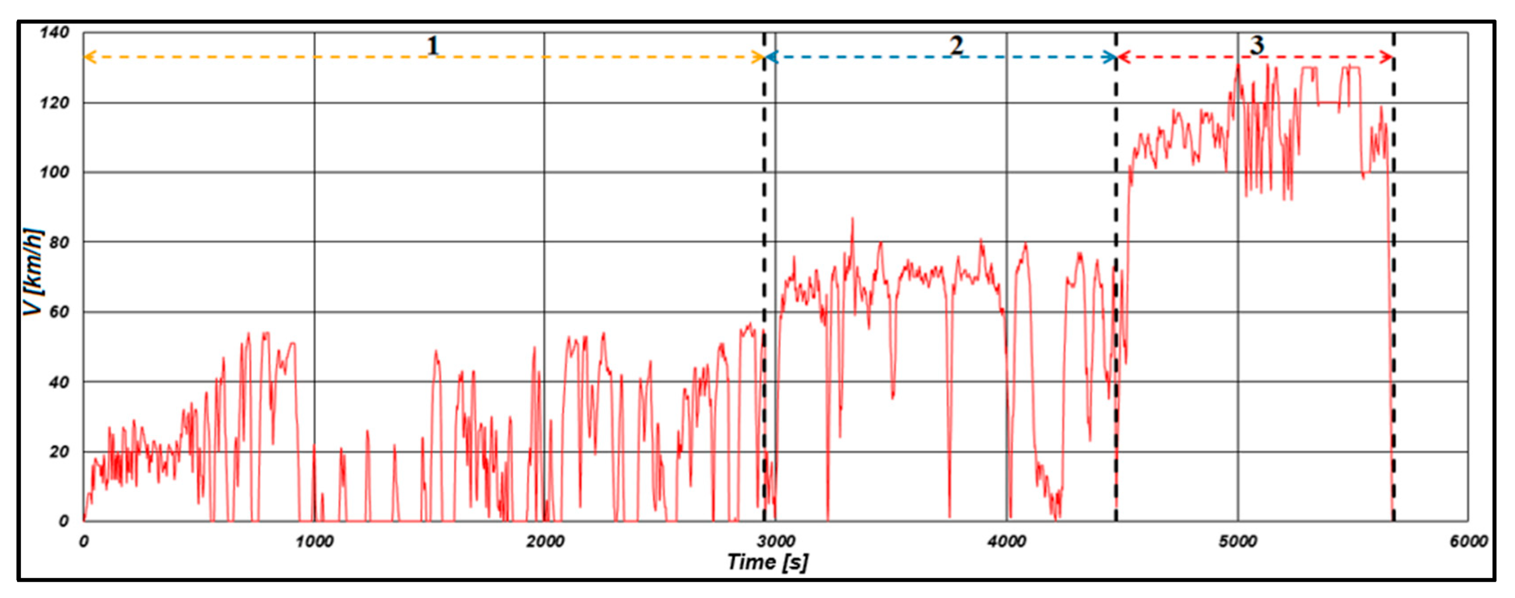 In the extra-urban area, namely the ring road of the capital, the northern part where the speed limits allowed the realization of the second phase of the cycle where the driving speed could be maintained in the speed range [60, 90] km/h, there were still sections where it was necessary to decelerate to very low speeds or sometimes even to a stop when pedestrian crossings or roundabouts were encountered.
