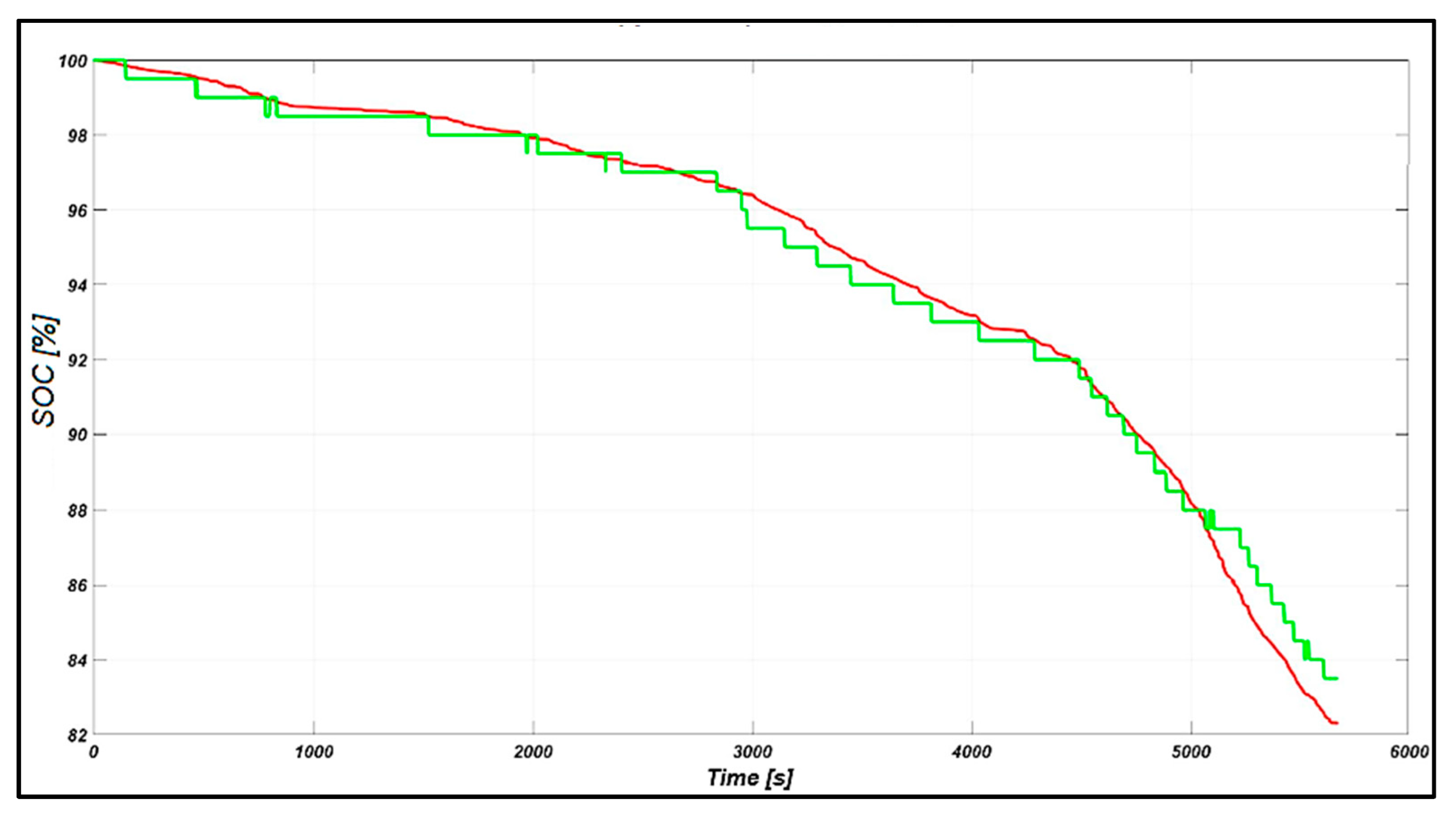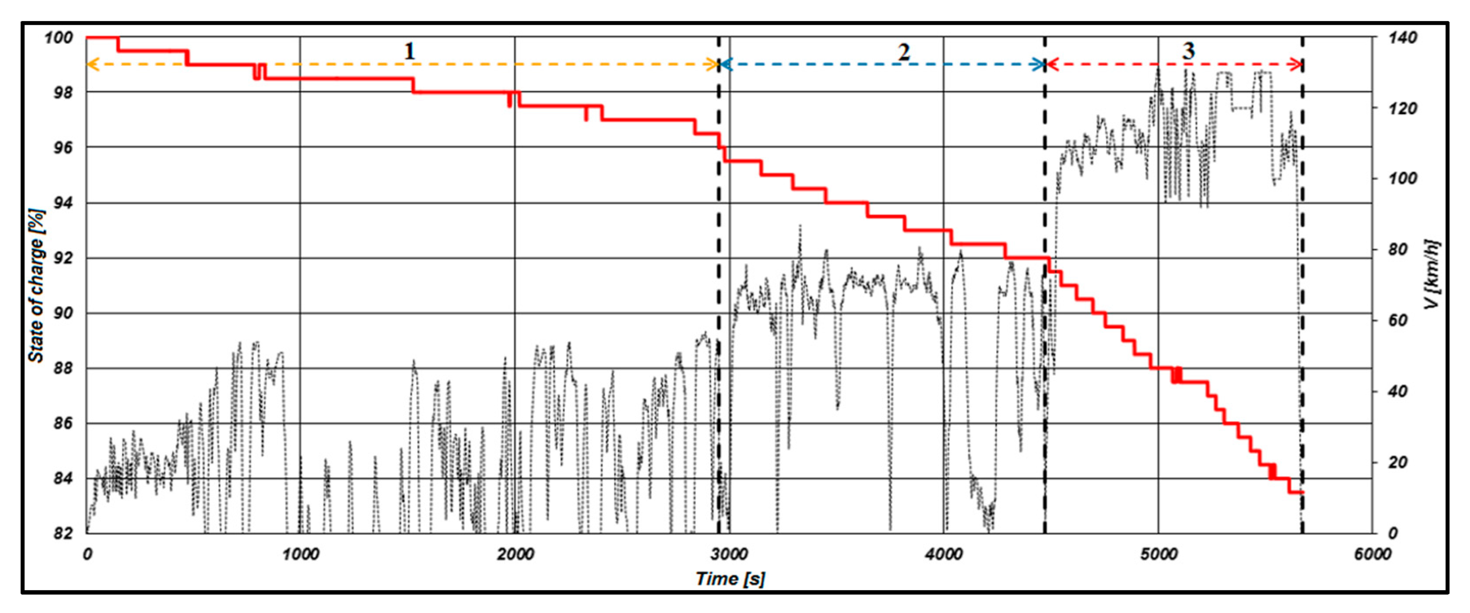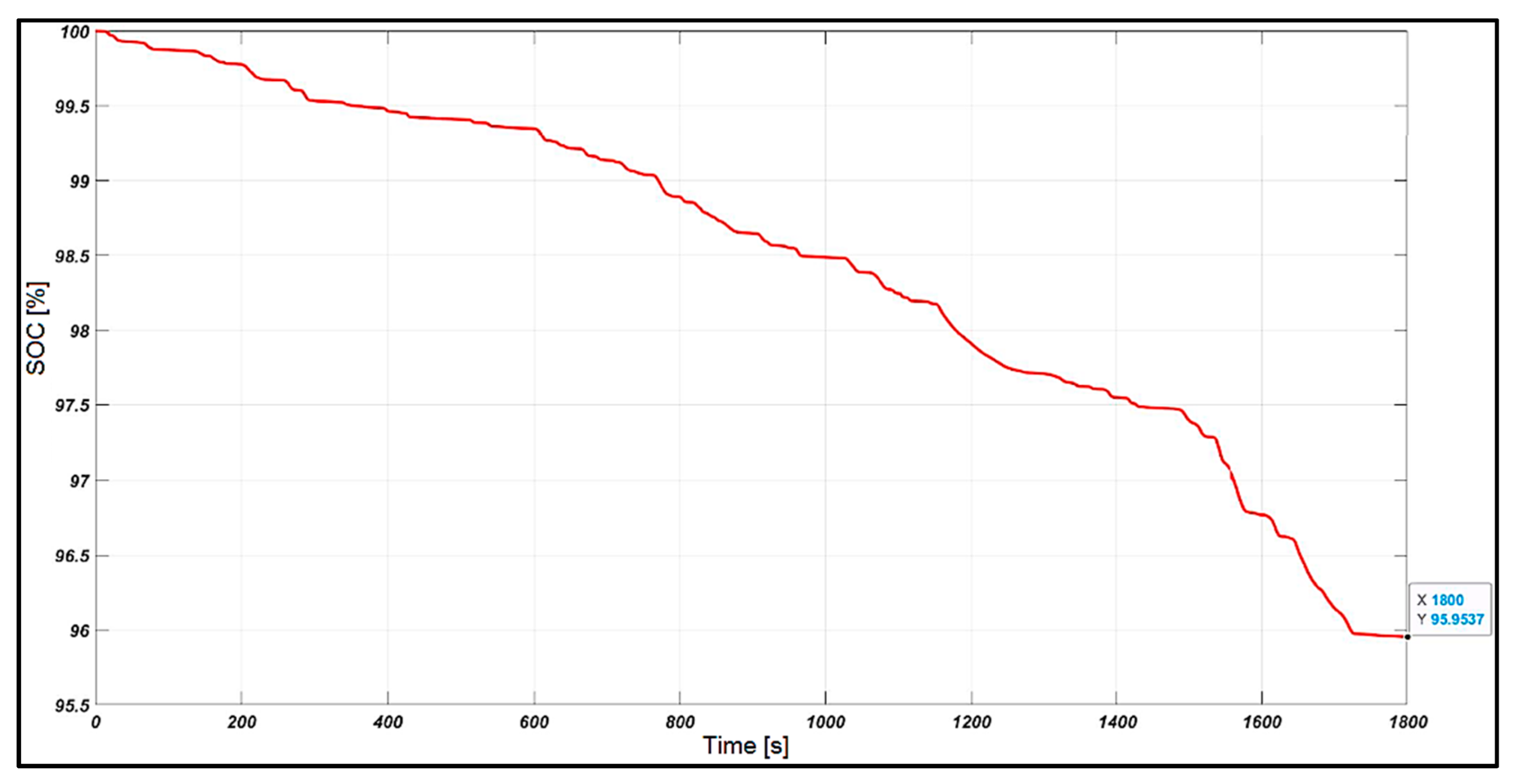 After a controlled charging process and sufficient time for stabilization, the state of charge of the battery at the start of the run cycle was 100%. During the urban driving phase, SOC decreased by 3.5%, reaching 96.5%; then, during the extra-urban driving phase, it decreased by another