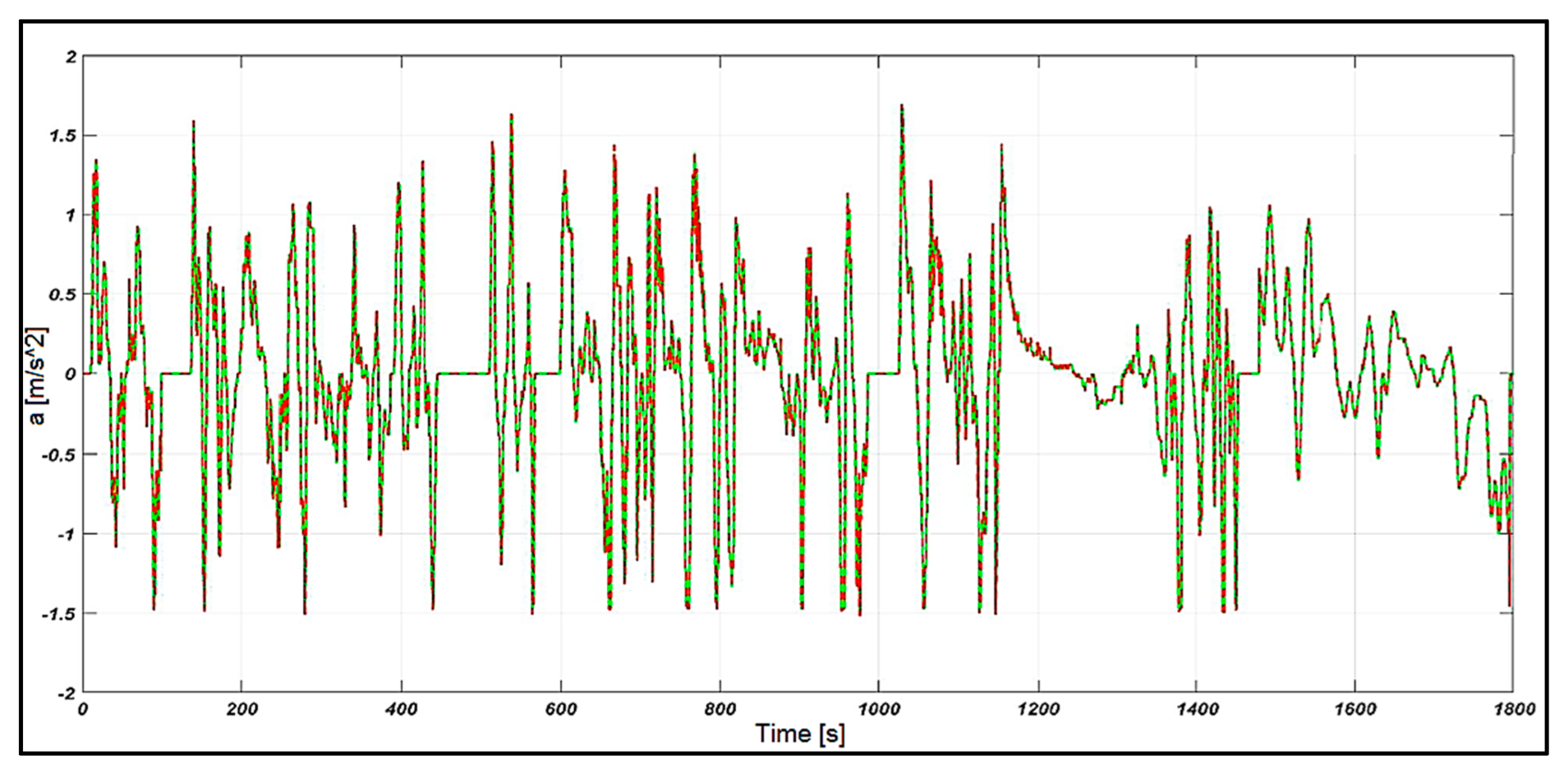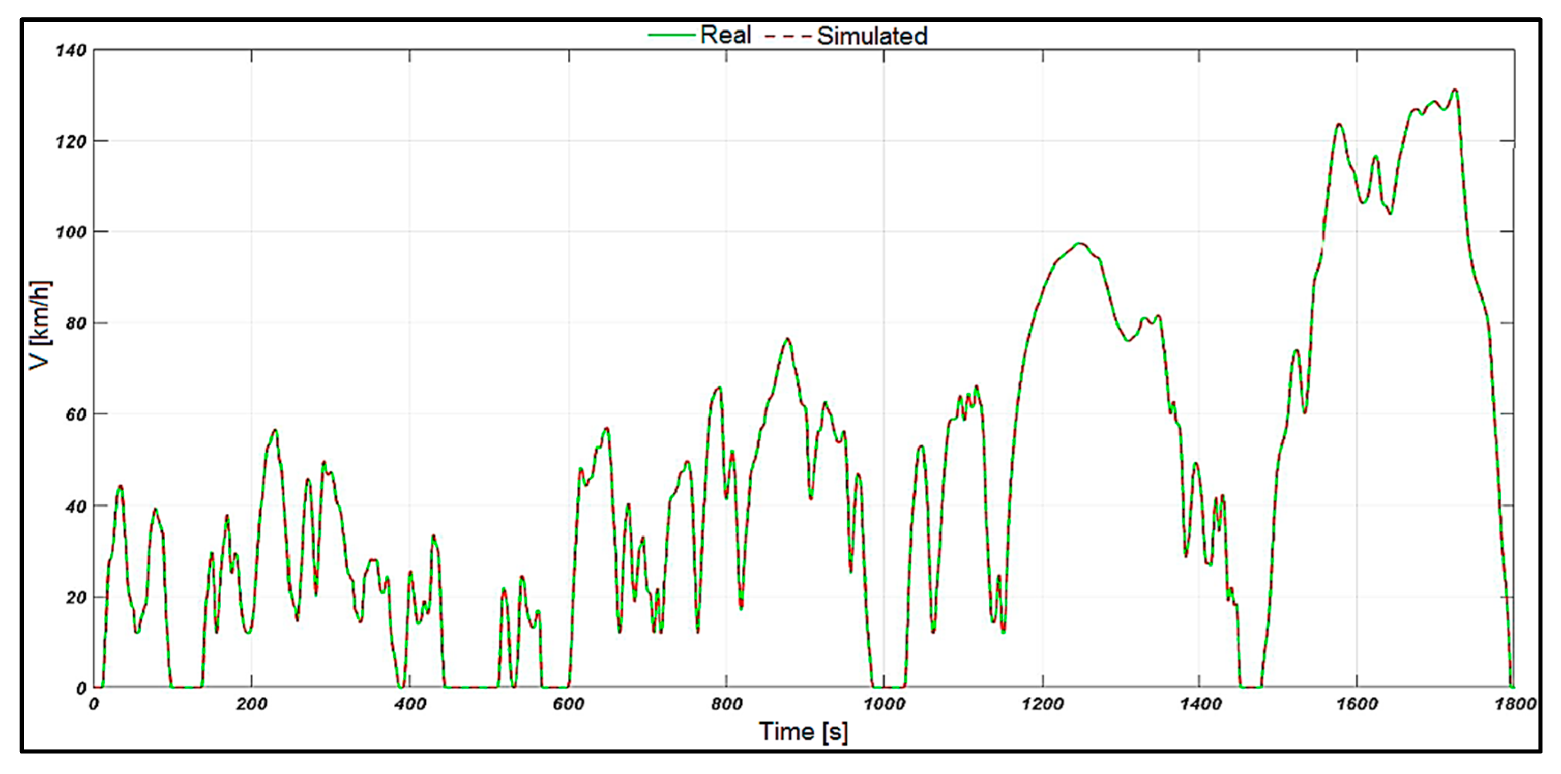 The differences between the values obtained experimentally and those from the simulation using the real speed profile are generated by the fact that certain conditions and situations encountered in reality cannot be 100% implemented in a mathematical simulation model, such as the precision of the developed subsystems, certain settings in the program options regarding the chosen step, the type of solver, as well as certain conditions that cannot be physically modeled or simulated in a manner that is similar to the traffic reality.