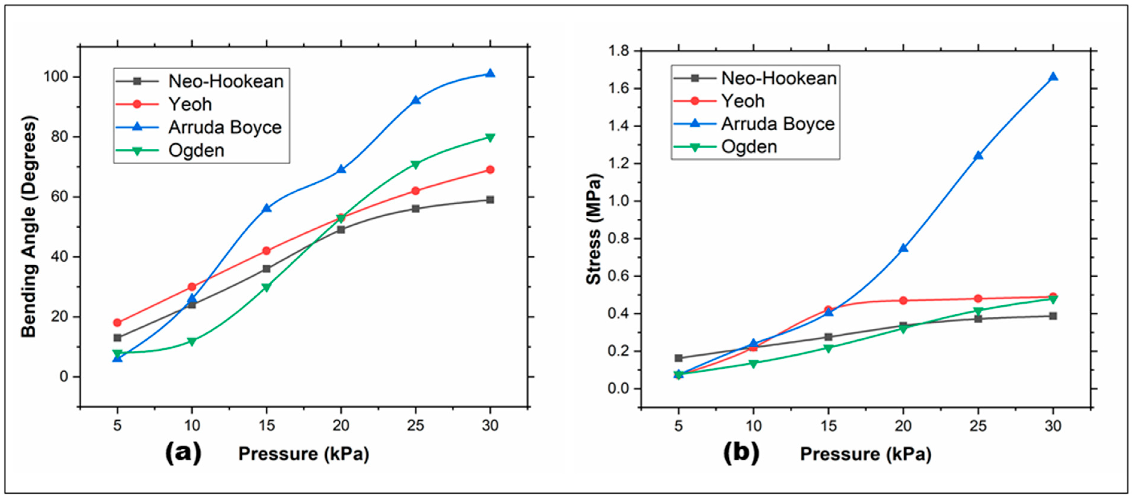 - NGariya; Kumar, P.; Prasad, B. Stress and bending analysis of a soft pneumatic actuator considering different hyperelastic materials. Mater. Today Proc. 2022, 65, 3126–3131. [Google Scholar] [CrossRef]