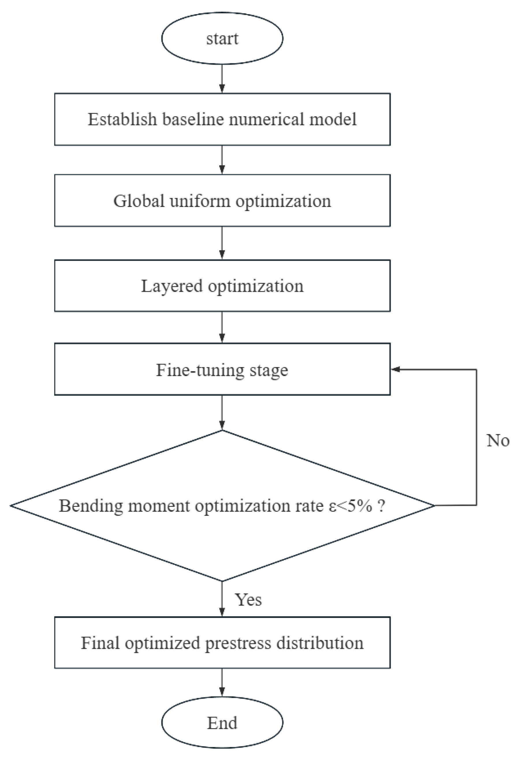 - Stage III (dynamic contraction search): starting from , define a search interval around each and perform a coordinated contraction search over all rows. At each iteration , update the prestress vector, re-evaluate the peak bending moment, and compute the relative improvement .