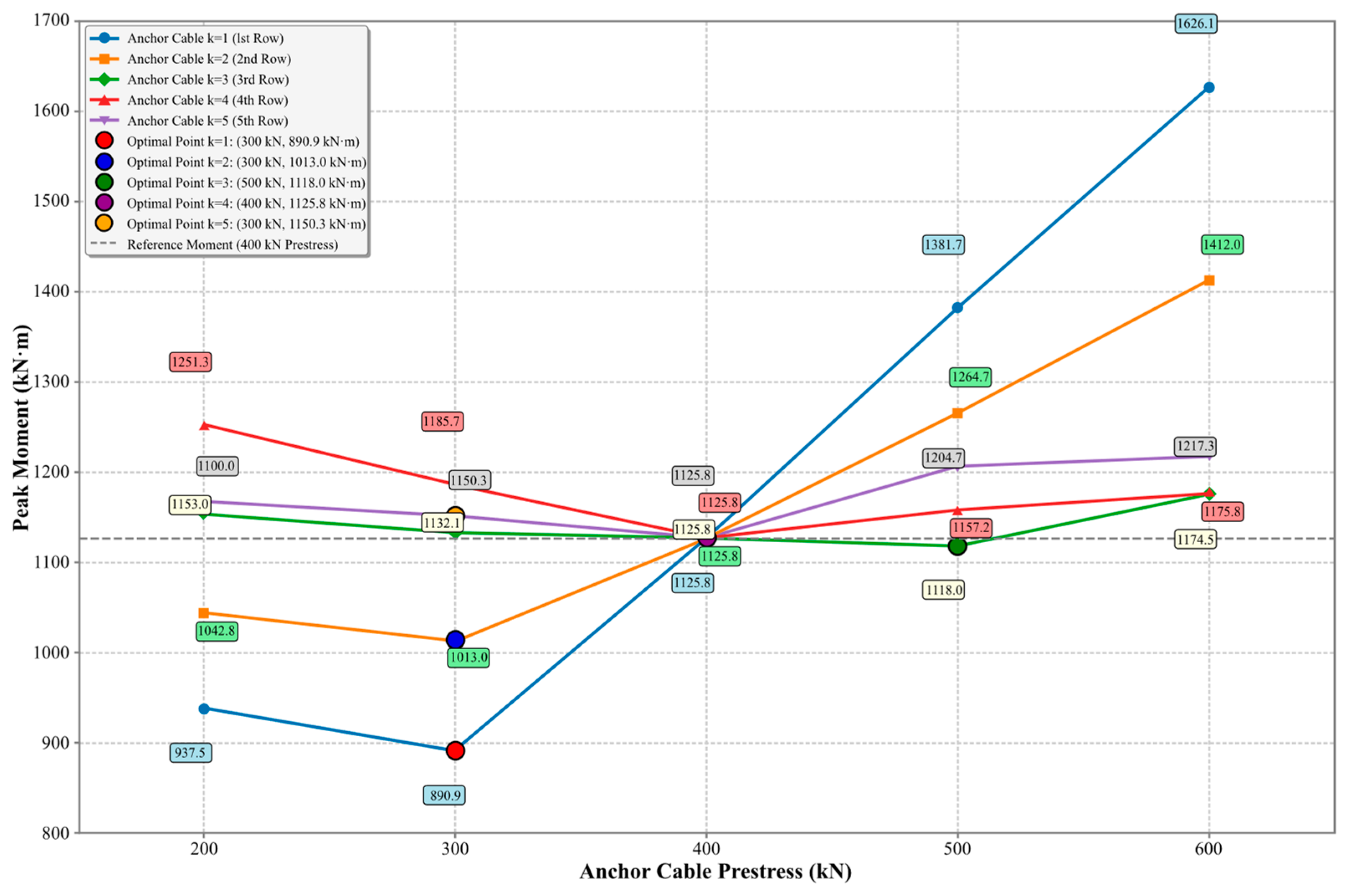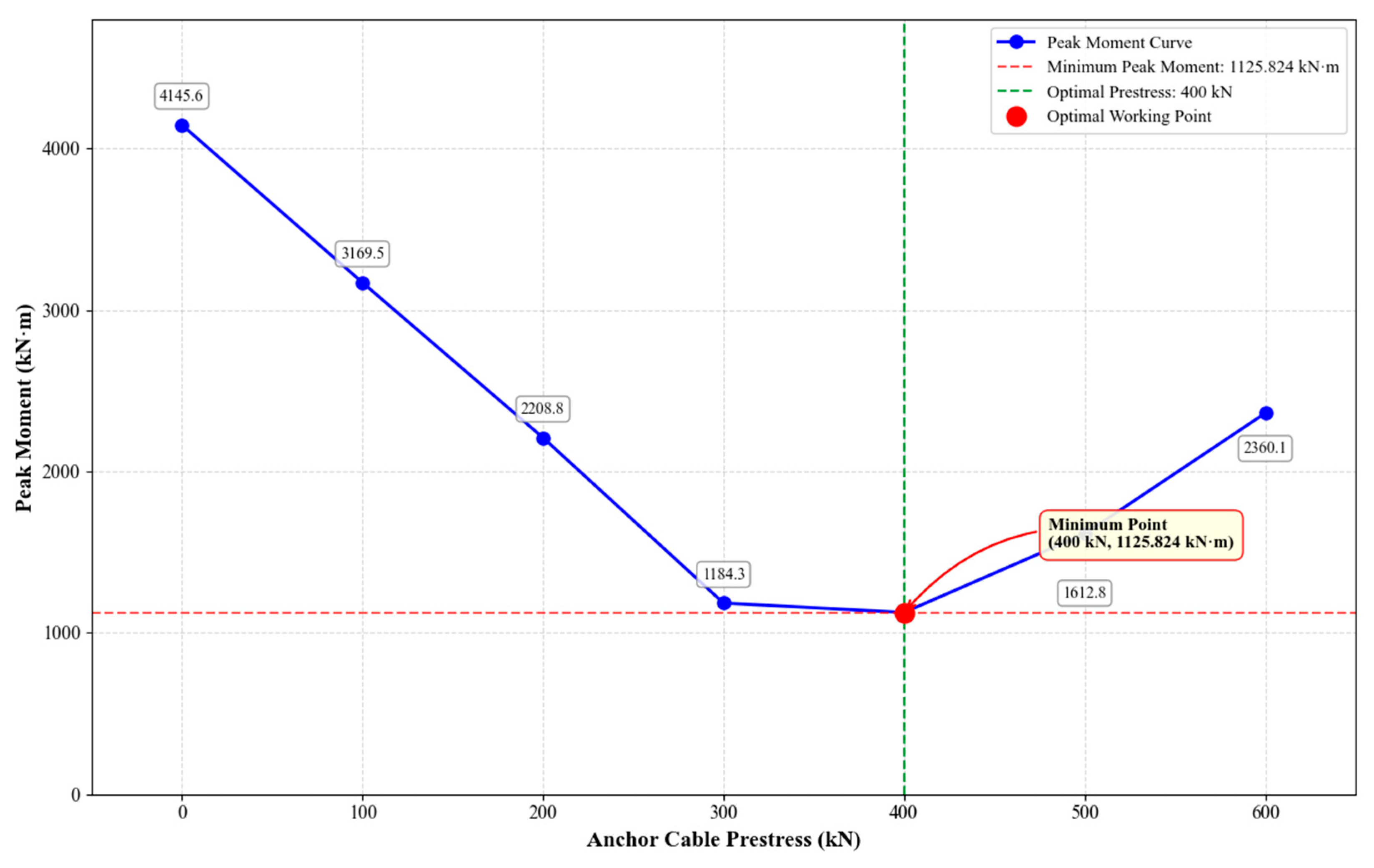 - Stage I (global baseline search): apply a set of uniformly increasing prestress levels to all anchor rows, run FLAC3D 9.0 for each level, and compute the corresponding peak bending moment . Select the baseline prestress that minimizes .
