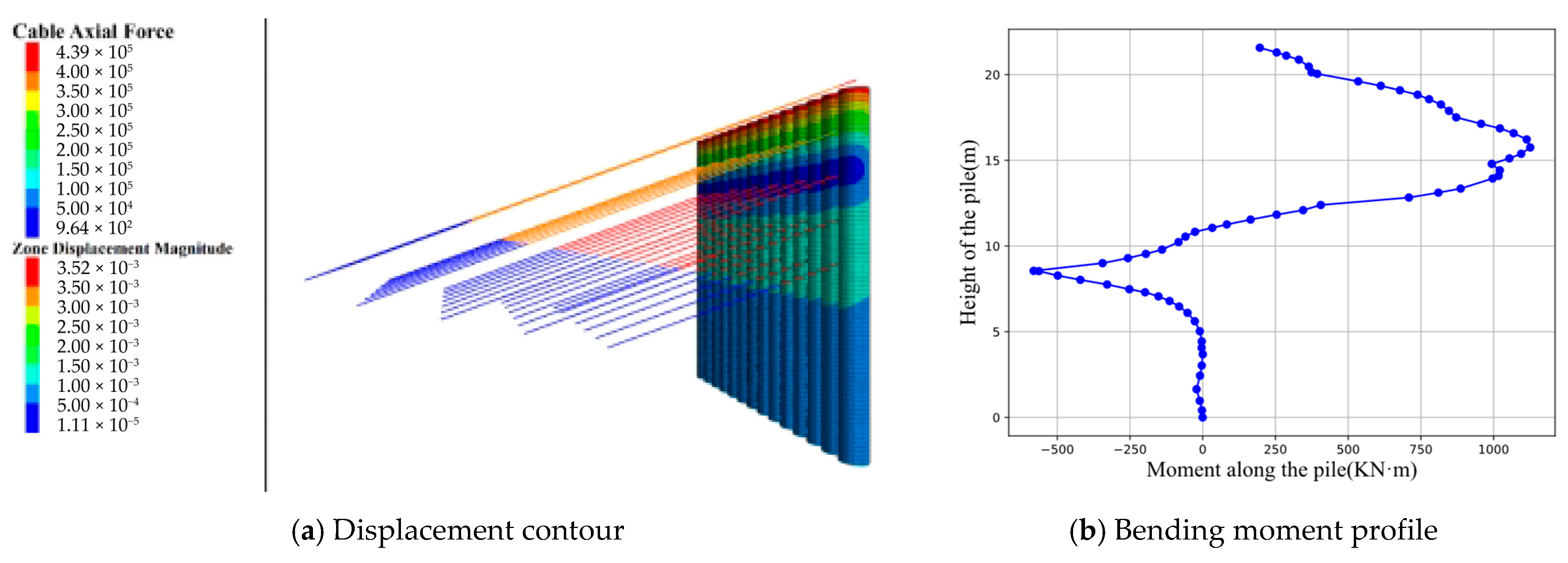 - Sun, Y.; Li, Z. Analysis of Deep Foundation Pit Pile-Anchor Supporting System Based on FLAC3D 9.0. Geofluids 2022, 2022, 1699292. [Google Scholar] [CrossRef]