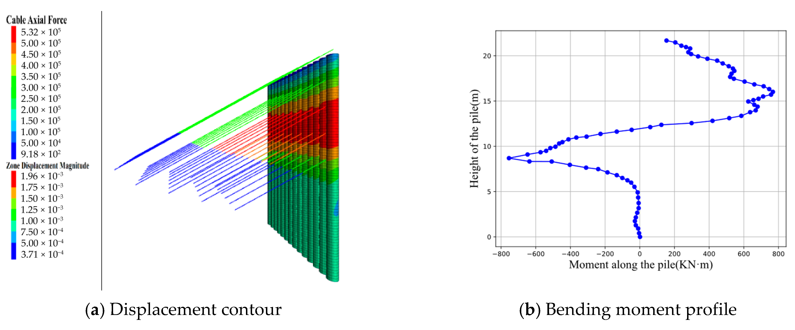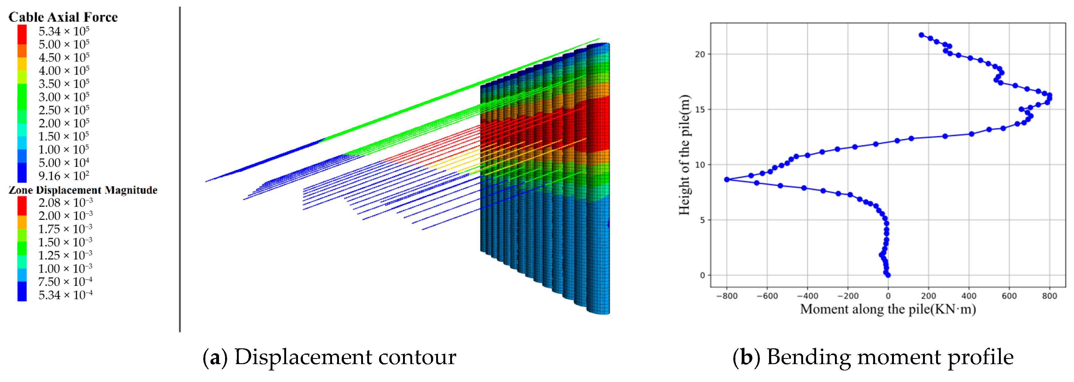 - Output the optimized prestress distribution for all anchor rows and evaluate the final displacement and bending-moment responses of the support system.