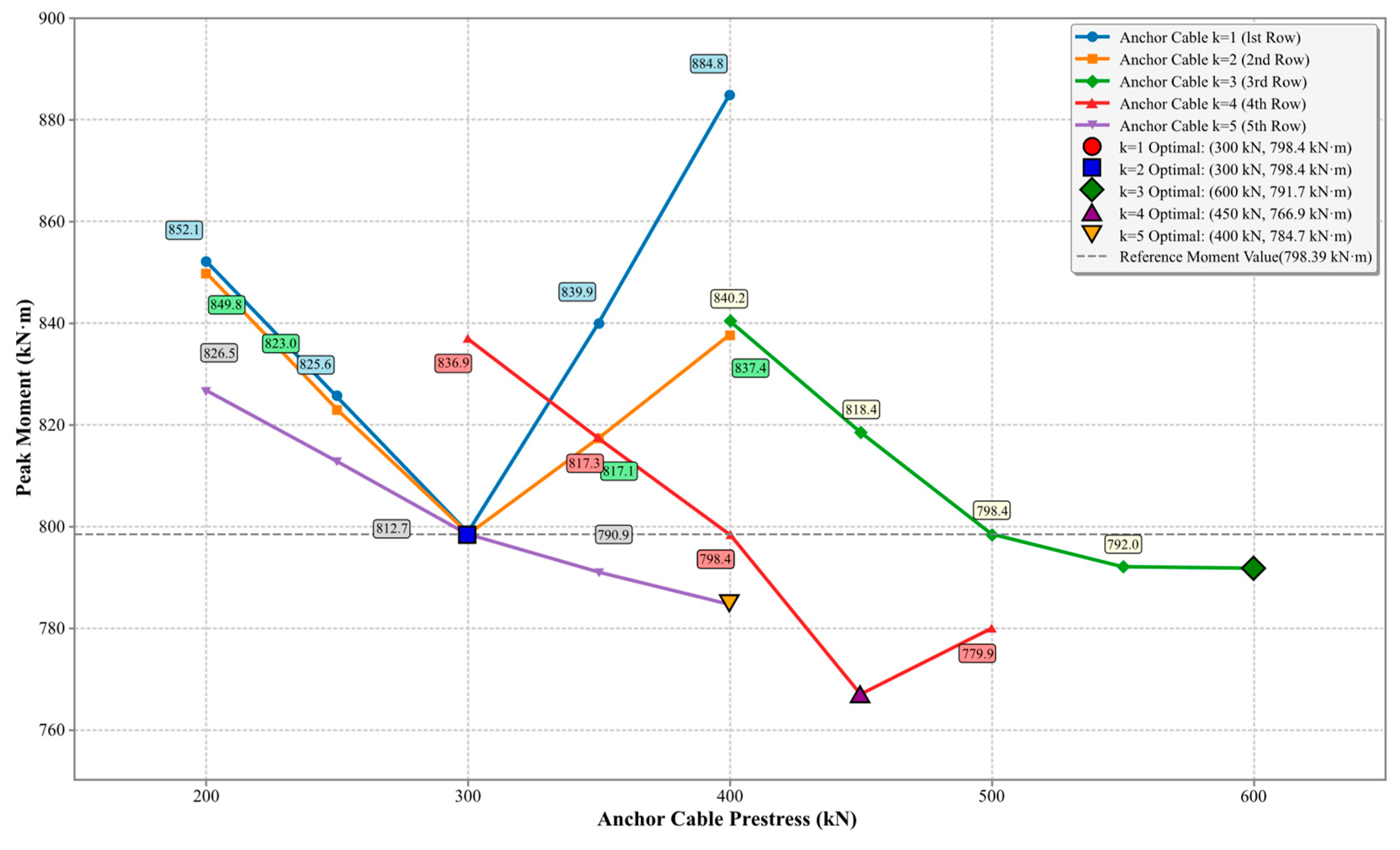 - Stage II (row-wise staged orthogonal design): for each anchor row in turn, vary the prestress of row around over a discrete set of candidate values while keeping the other rows fixed at , and determine the optimal prestress that minimizes the peak bending moment. Assemble the row-wise optimal vector .