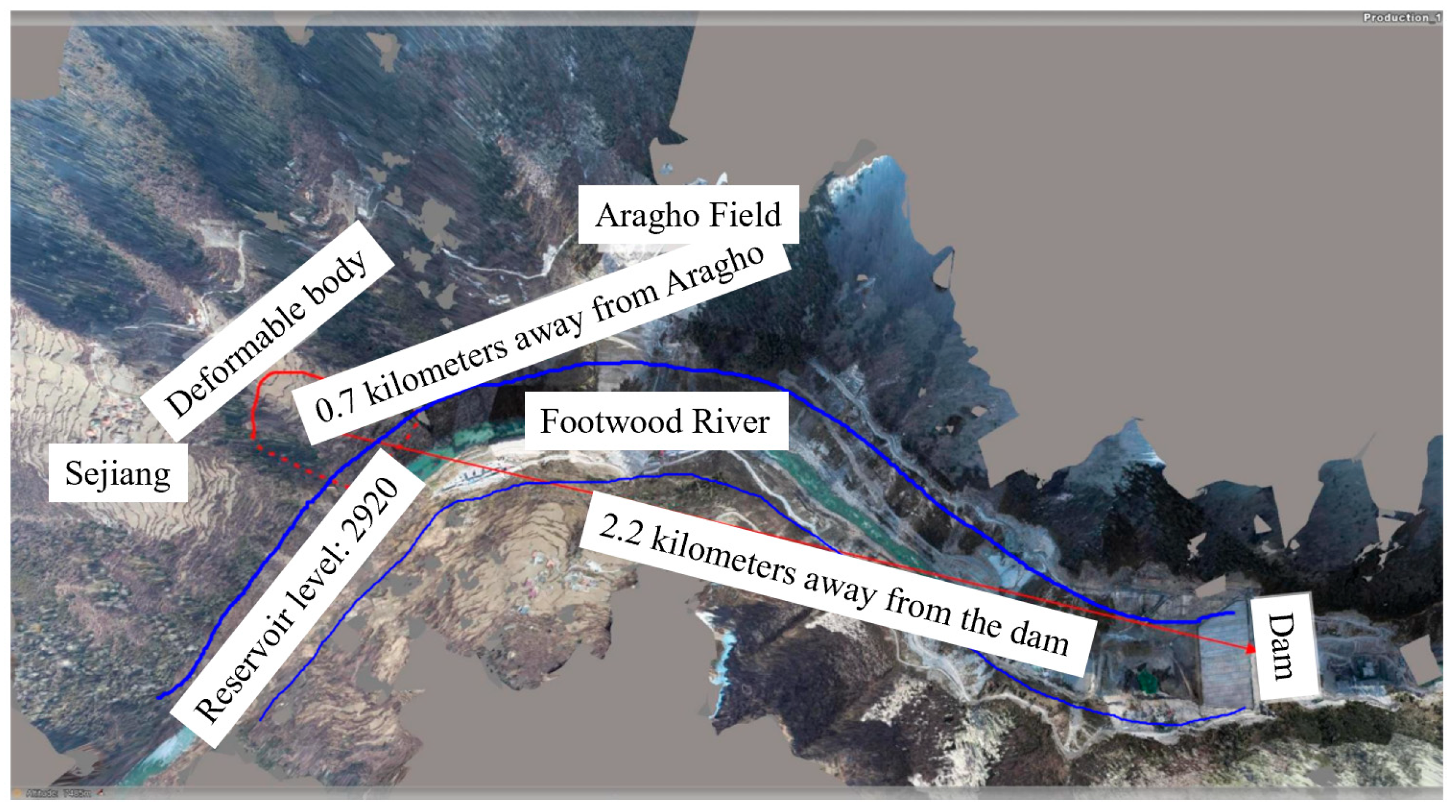 The river course in the study area generally takes a “bow” shape: the flow direction of the river section where the deformation body is located is S30° E, and it turns to S25° W after passing through the deformation body. After crossing the Ya La Gully, it further changes to S60° W and flows directly towards the dam. The riverbed elevation at the deformation body is approximately 2825 m, and the original natural valley width is about 80 m. Under the normal storage water level (2900 m), the river surface width expands to about 330 m (