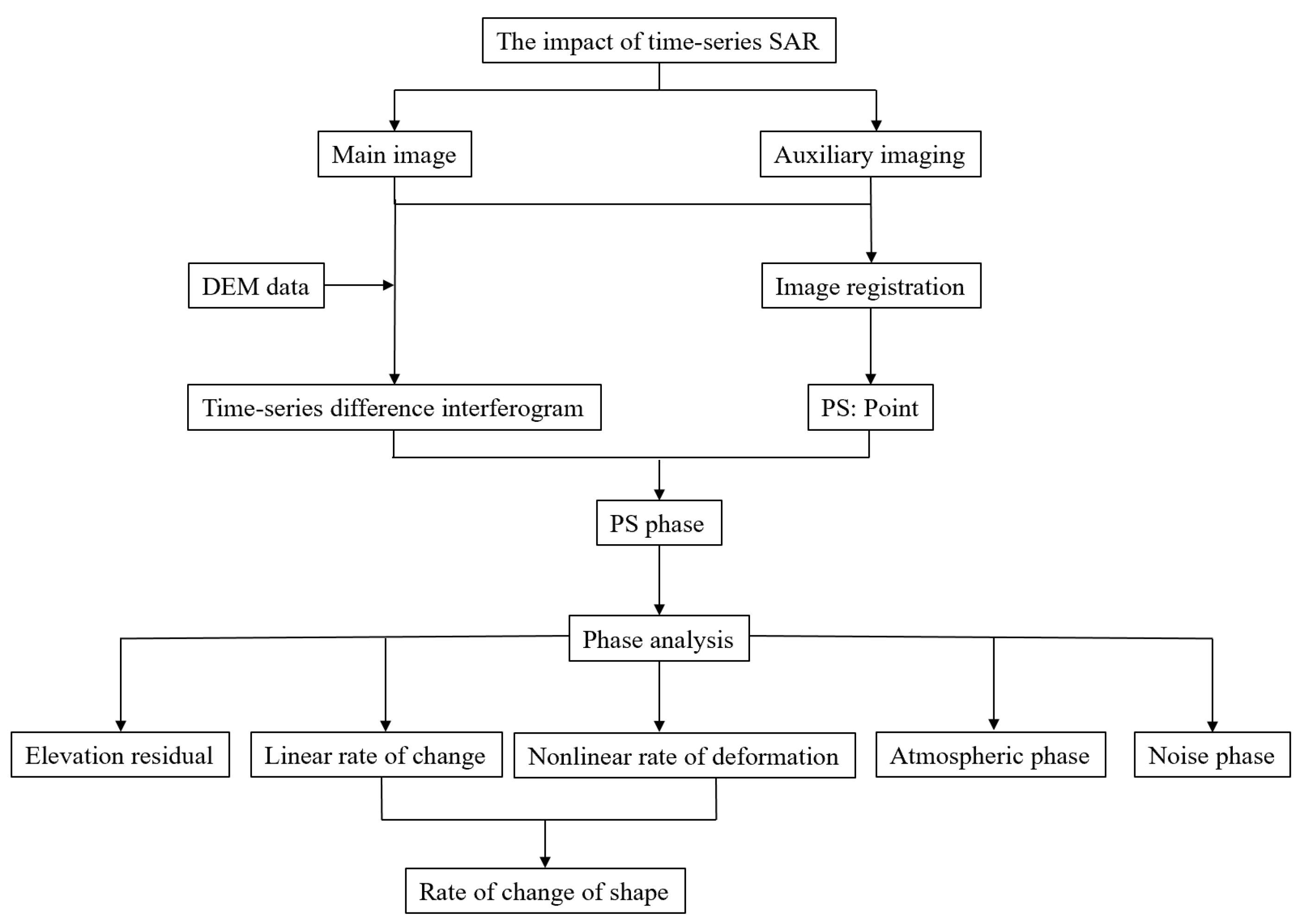 “Persistent Scatterer InSAR” (PSInSAR) significantly reduces the effects of decorrelation and phase noise by selecting “persistent scatterers (PS)” pixels that exhibit high coherence across dozens to hundreds of images from the scene. This approach provides an effective means for long-term deformation monitoring with centimeter-to-millimeter accuracy. The technical flowchart is shown in