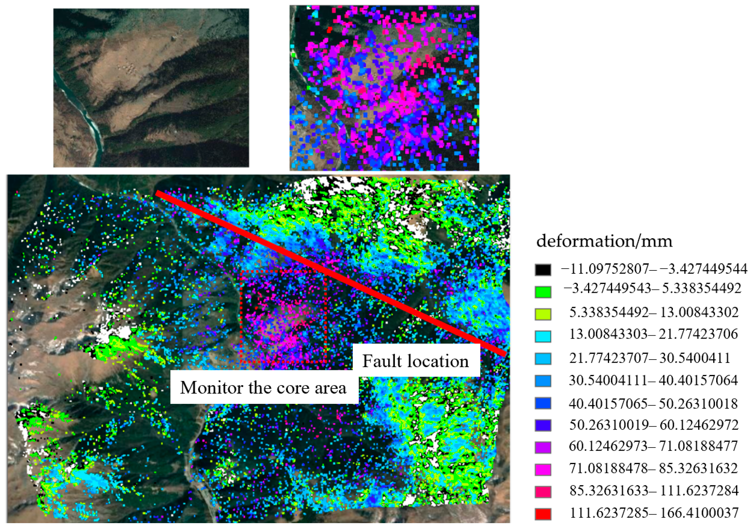 Figure 3: The PS-InSAR time-series inversion results (shown as colored dots in the figure) indicate that within the 4 years and 2 months observation period, the cumulative displacement along the line of sight (LOS) in the study area ranged from −11 mm to +166 mm. The spatial distribution showed a distinct NW–SE oriented band-like difference: