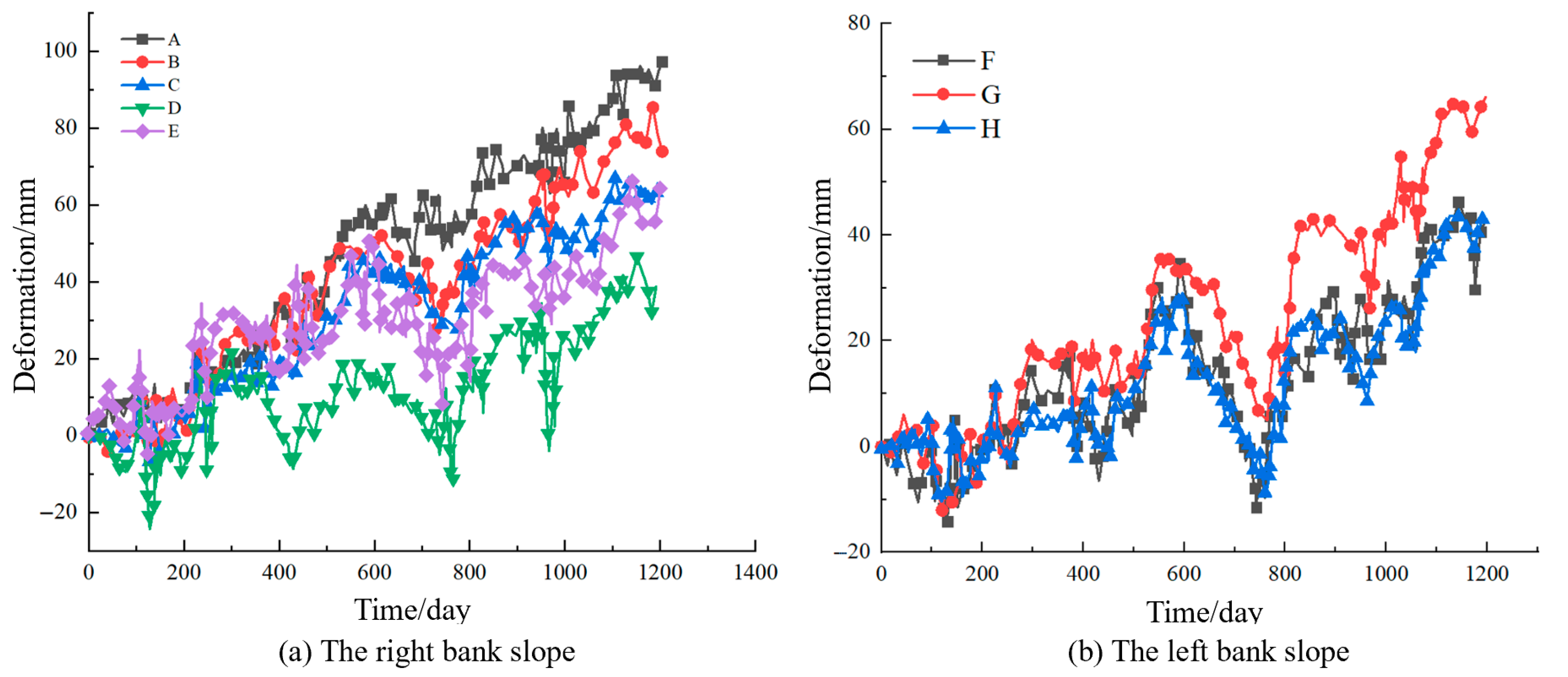Figure 4, eight monitoring points were set on the slope to observe the changes in settlement and displacement from 2021 to 2025 (A–H), thereby analyzing the stability of the surrounding rock of the water-facing slope.