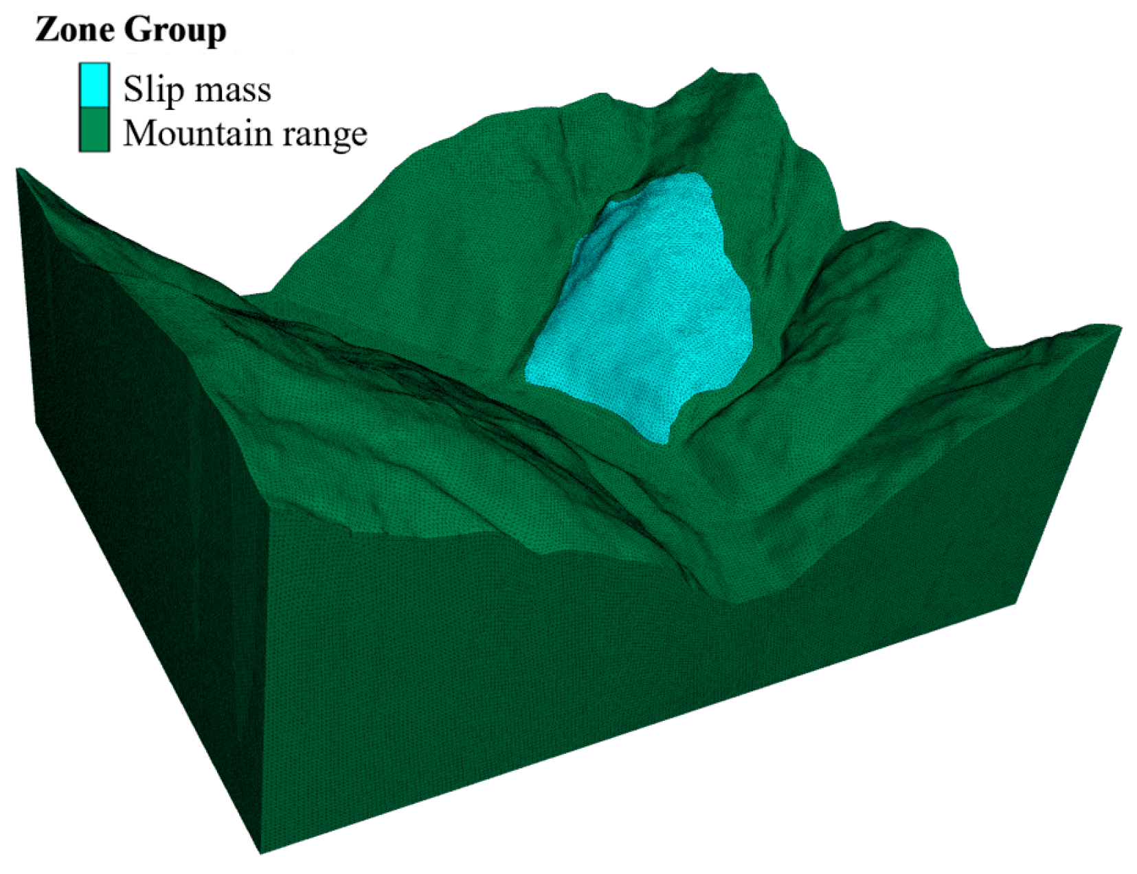20]. Firstly, the modeling was carried out using the Rhino 7.0 software, which fully included key geological units such as the deformation body, bedrock, weak interface between bedrock and overburden, and the surrounding slope. Then, the meshing was performed, and the meshing was carried out using the “partitioned densification + gradual transition” refined method. Different regions were set with differentiated mesh sizes to balance the calculation accuracy and efficiency: the core research area (the deformation body and the interface between bedrock and overburden area) used structured hexahedral elements, with a uniform mesh size of 5 m, ensuring precise capture of the deformation and stress characteristics of the shear slip zone; the transition area (the stable bedrock area around the deformation body) had a gradually changing mesh size to 10 m, and the mesh size in the model boundary area was further enlarged to 20 m, avoiding the interference of boundary effects on the calculation results. After mesh generation, the mesh quality was verified through the built-in mesh quality check module of FLAC3D, and the distortion rate of the elements was all less than 5%, and the overall mesh quality met the requirements for multi-field coupled numerical simulation. The model exhibits typical mountainous landform features, including steep slopes, valleys, and ridge topography. The blue areas in the figure represent the locations where instability sliding may occur. In the model, these blue areas are set as interface contact surfaces to simulate the shear sliding behavior of the rock mass along weak structural planes. This processing method allows this area to undergo relative sliding and sudden displacement changes under external loads (such as gravity, self-weight, water pressure, etc.), thereby more realistically simulating complex geological processes such as slope instability and landslide evolution.