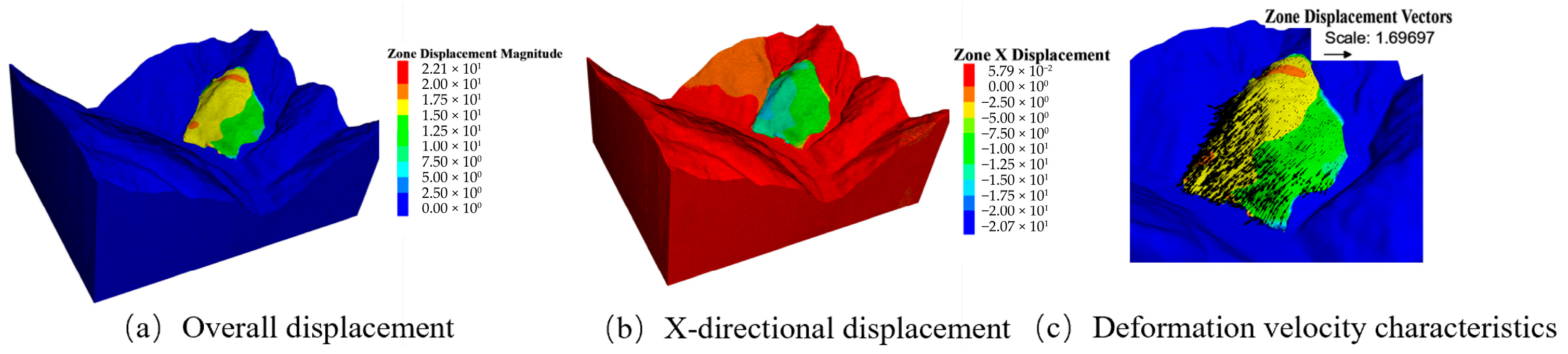 Figure 7c, the maximum deformation velocity occurs in the lower toe area of the deformed body, which is the “outflow” position of the deformed body in the river mouth section. This velocity value indicates that there is a significant “sliding impact effect” during the instability process of the deformed body. The overall risk of entering the river is relatively low: although the velocity is the highest in the bottom river entry section, due to the lagging response of the upper deformed body, no coordinated acceleration mechanism for overall failure was formed. Therefore, it is judged that this landslide tends to be a local acceleration-splintering type landslide at the end of the movement rather than the “overall type of sliding into the river” collapse mode.
