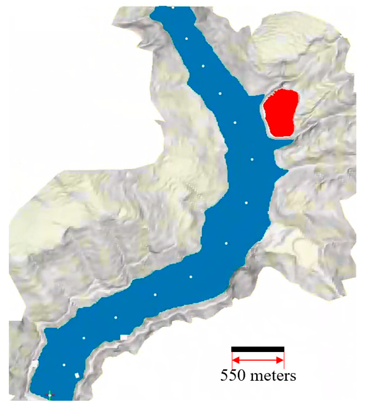 21]. This model is based on the measured terrain data and reconstructs the three-dimensional terrain and water distribution of the deformed body before and after it enters the water. The blue area represents the reservoir water body, the surrounding light gray area represents the terrain and topography of the two banks, and the red area in the upper right corner is the assumed position of the deformed body, simulating its instability and water entry process as well as the wave propagation effect caused by it. The model also sets up multiple monitoring points (marked in white) to record key physical quantities such as wave height and water level changes, providing basic data support for the subsequent analysis of wave propagation laws. The overall model construction fully considers the complexity of the terrain and the geometric characteristics of the deformed body, and has a good degree of terrain restoration and physical authenticity.