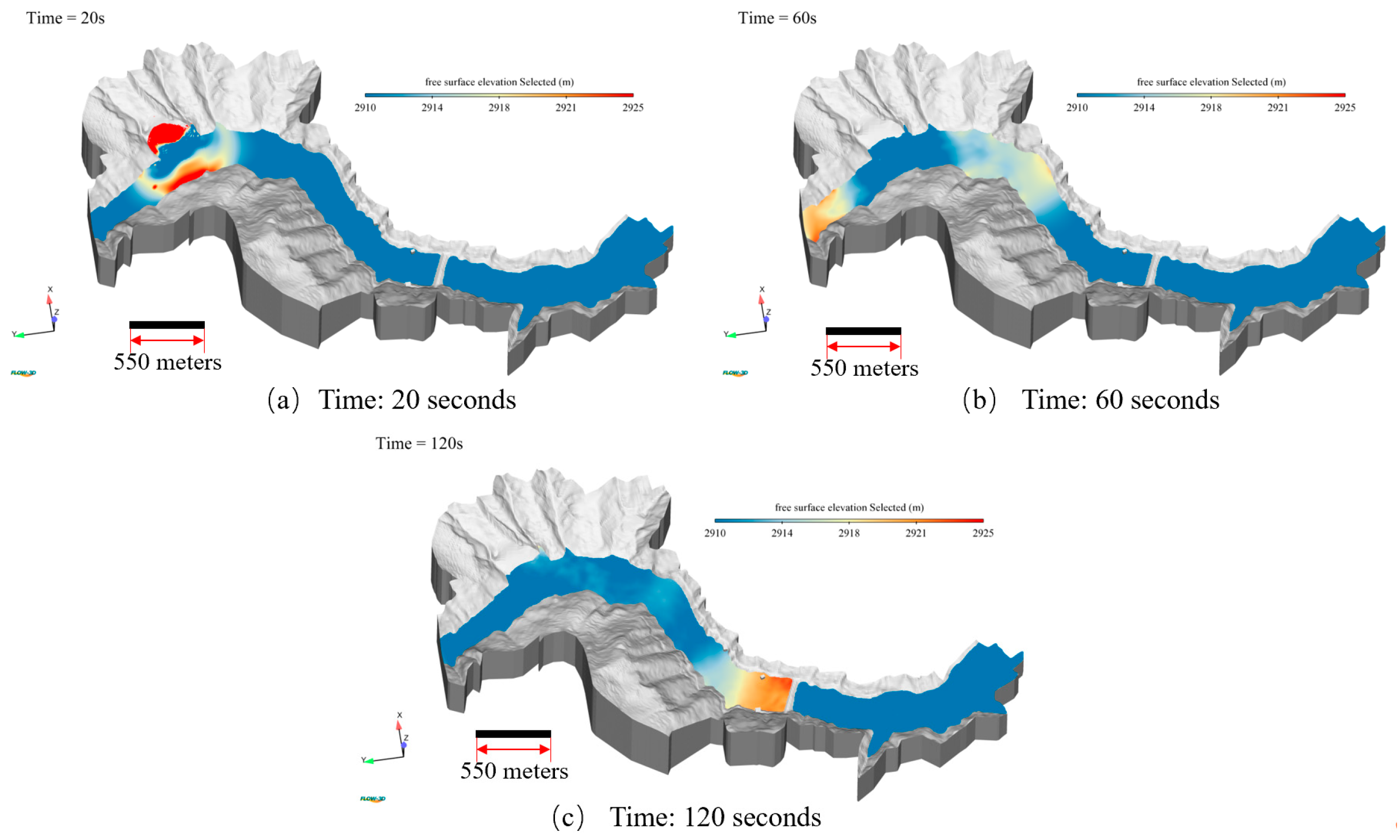 To investigate the disturbance effect of large-scale deformable bodies on the water body in the reservoir area under the condition of medium-high speed water entry, the volume of the deformable body was set at 2.1 million cubic meters, the initial sliding speed was 24 m/s, and the initial water surface elevation was 2910 m. The free liquid surface distribution situations at three critical moments of 20 s, 60 s, and 120 s were compared and analyzed, as shown in