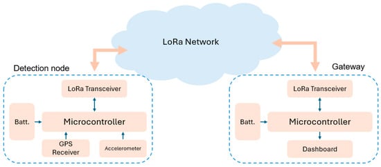 The proposed system architecture is shown in Figure 1. The system consists of two main subsystems: the IoT-Node (Detection node) and the Gateway. The IoT-Node is responsible for collecting data through an accelerometer sensor, which acts as a trigger: whenever movement is detected, the system is activated, and the node sends the geographic coordinates and the location’s tilt data to the Gateway via LoRa network. Gateway, in turn, is responsible for receiving the data, displaying it on a HyperText Markup Language (HTML) website, and generating an alert when necessary. The detection node system is composed of the following: LILYGO T-Beam, Shangai, China [19] that uses (embedded) LoRa transceiver SX1276, Semtech, Camarillo, CA, USA [20] operating at 868 MHz and NEO-6M, ublox, Zurich, Switzerland [21]; GPS receiver, also embedded; ADXL335 accelerometer, Analog Devices Inc., Norwood, MA, USA [22]; Battery 18650 [23]. The Gateway system is composed of an Arduino Pro-Mini, Qualcomm, Ivrea, Italy [24], a LoRa module RFM95, Semtech, Camarillo, CA, USA [25], a Battery 18650, a USB interface for a laptop (Intel [26] i3, 8G Random Access Memory (RAM)) with a web interface for a dashboard.