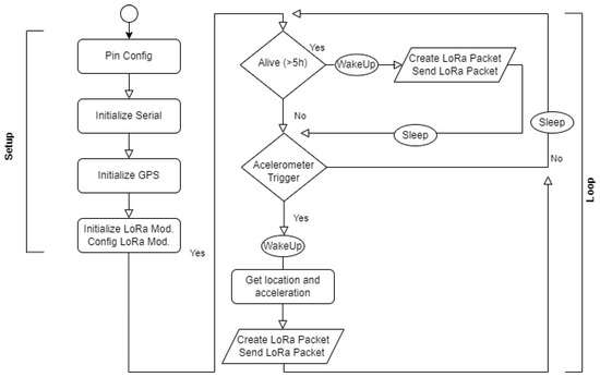 The controller used in the experiment for the IoT detection node is the LILYGO T-Beam, which provides an integrated and efficient solution for IoT applications with long-range communication. I chose this platform because it combines the ESP32 Shangai, China [27] microcontroller, the NEO-6M GPS module, Zurich, Switzerland, and the SX1276 LoRa radio, Camarillo, CA, USA, on a single board, simplifying hardware and reducing power consumption. Additionally, its support for an 18650 battery ensures extended autonomy, which is crucial for remote projects. Although the T-Beam does not include an integrated motion sensor, its architecture allows for the easy connection of external sensors, such as accelerometers, via General Purpose Input/Output pins. ESP32 is the “brain” of the LILYGO T-Beam, Shangai, China. It features 448 kB of Read-Only Memory (ROM), 520 kB of Static Random Access Memory (SRAM), and 16 kB of SRAM in the real-time clock. It stands out due to its dual-core 32-bit Xtensa LX6 [28] processor running up to 240 MHz, enabling efficient multitasking, such as simultaneously managing LoRa communications and GPS data processing. This capability makes it ideal for processing location information, managing wireless communication, and integrating potential additional sensors, such as motion sensors connected via General Purpose Input/Output pins. In terms of energy efficiency, the ESP32 offers multiple deep sleep modes (used in firmware of our experience), allowing efficient management of peripherals, such as turning off the GPS when not in use.