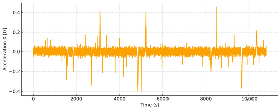 The inclination of the sensor with respect to the X-axis is expressed by this equation. The same argument is valid for the Y and Z axes, giving rise to the respective angles, and . When the accelerometer lies flat, , while , resulting in . As the sensor is tilted, the projections vary according to the cosine law, and the computed inclination increases proportionally [30,31,32]. By tracking the evolution of , , and over time, the system can infer multi-axis displacements and detect early deviations that may precede structural or ground failure.