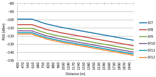 Figure 16 illustrates the SNR at 6 dBm. Initially, SF7 has a much greater SNR for close distances, but it declines quickly. Increased SFs then trace more compressed paths and enter the 0 dB area at roughly the same time as or just after SF7. The area of negative SNR at greater distances denotes the anticipated deterioration caused by the combination of propagation loss, multipath dispersion, and without line-of-sight segments along the route.