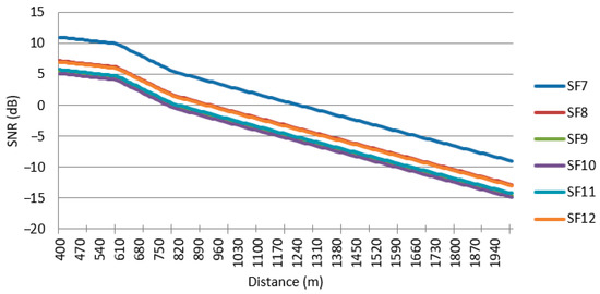 At 14 dBm (refer to Figure 17), the starting SNR for every SF is more than that of the others. SF7 is still the best option for short distances in this case, but the difference between higher SFs and SF7 increases earlier as the distance grows. SF10–12 keep the SNR in the usable range for a longer distance, thereby confirming that the pairing of higher power and SF is still the best for real-world situations of poor propagation.