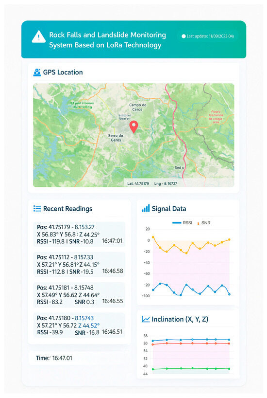 The web dashboard shown in Figure 18 was developed for real-time monitoring of data collected by sensor nodes. The geographical location (GPS map with the node position), the instantaneous RSSI, and SNR values received at the gateway, along with the inclination in each of the axes (X, Y, Z) calculated from the Micro-Electro-Mechanical Systems accelerometer, are integrated in a single panel through the interface. This combination of information allows for direct correlation of radio performance with the mechanical condition of the sensor by providing a complete operational view of the state of the system in the field.