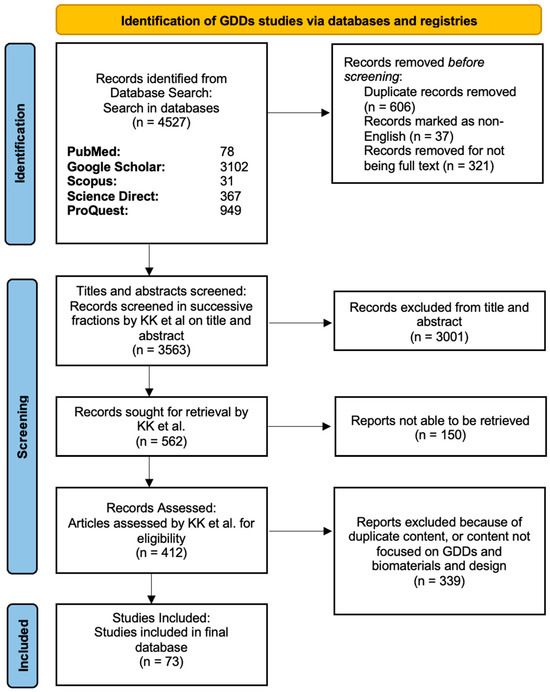 PRISMA diagram showing the screening process in the GDDs article search. In the stepwise flowchart, the exclusion criteria and number of articles removed are shown.