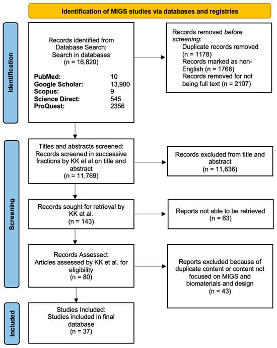 We followed the standards outlined by Preferred Reporting Items for Systematic Reviews and Meta-Analyses (PRISMA) guidelines (www.prisma-statement.org) (accessed on 9 December 2025) during data collection. For the GDDs search, we used keywords and MeSH terms such as “glaucoma drainage device” (or “GDD”), “glaucoma drainage implant”, “biomaterials”, and “biocompatible” (Figure 3). For the MIGS search, we used keywords and MeSH terms such as “minimally invasive glaucoma surgery” (or “MIGS”), “microinvasive glaucoma surgery”, “biomaterials”, and “biocompatible” (Figure 4). The PICOS (Population, Intervention, Comparison, Outcomes, and Study) framework (https://libguides.mssm.edu/ebm/ebp_pico) (accessed on 9 December 2025) was used to create eligibility criteria (Table 1).
