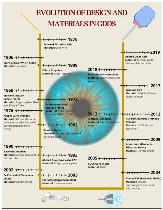 The advent of biomaterials in glaucoma surgery started in earnest with the introduction of iridectomy by Von Graefe in 1857 [5,13]. He recognized that patients who developed a bleb following an iridectomy had more favorable visual outcomes in the future, thus introducing the idea of filtering procedures. In 1867, French ophthalmologist Louis De Wecker discovered that inclusion of the iris within a corneal incision (iridencleisis) led to a filtering bleb, which formed the basis for the development of current filtering surgeries [14]. This section will discuss the evolution of design and materials used in GDDs (Figure 5).
