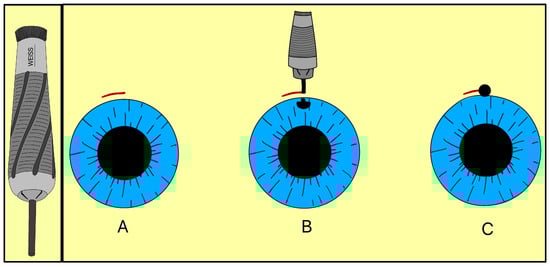 Elliot’s trephine (left) and procedural steps (right). (A) Limbal conjunctival flap; (B) Creating a scleral hole; (C) Completed sclero-corneal trephining operation. Adapted from [15].