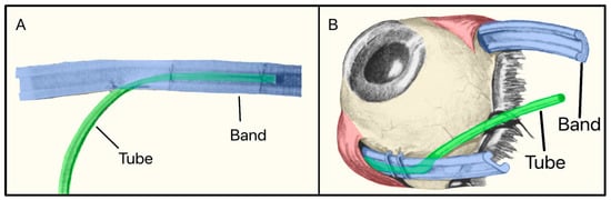 (A) The Schocket shunt showing the tube and the silicone band; (B) The Schocket shunt placed on the eye. Adapted from [25].