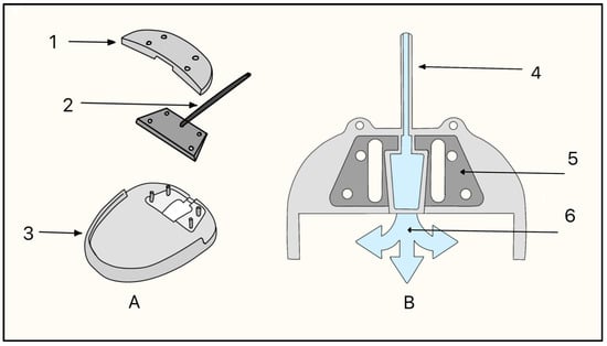 Ahmed glaucoma valve components. (A) 1 = Valve system, 2 = Silicone drainage tube, 3 = Silicone Plate; (B) Ahmed Glaucoma Valve flow mechanism, 4 = Silicone drainage tube, 5 = Valve system, 6 = Fluid flow. Adapted from [31].