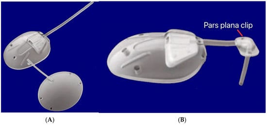 (A) Silicone double-plate model of the Ahmed FX1 (364 mm2); (B) Silicone model of the Ahmed PC7 (184 mm2) showing the pars plana clip. Adapted from [31].