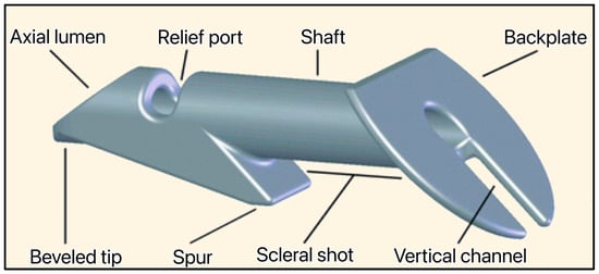 The Ex-PRESS Mini glaucoma shunt showing the beveled tip, axial lumen, relief port, spur, shaft, scleral shot, backplate, and vertical channel. Courtesy of Alcon [34].