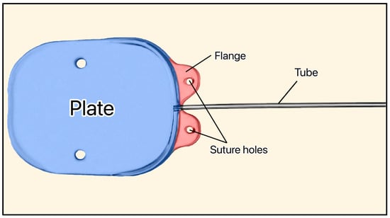 The implant consists of a curved oval silicone plate, measuring 18 mm × 13 mm, and the tube is made of a silicone elastomer (OD: 0.58 mm, ID: 0.38 mm) and has a slit valve at its distal end, where it rests on the plate. The slit-valve is calibrated to open at a pressure between 10–12 mmHg and close at a pressure between 8–10 mmHg [21,22].