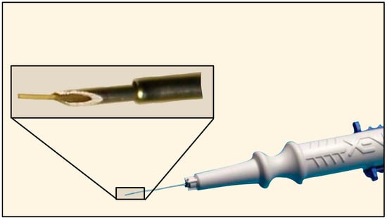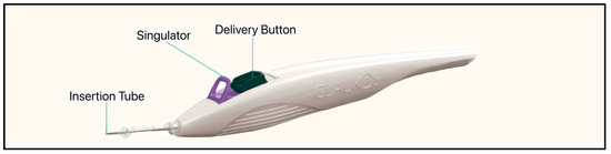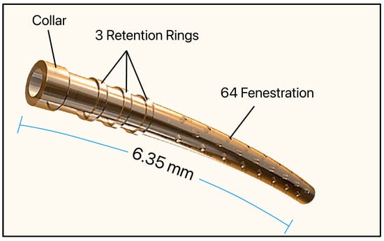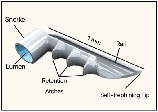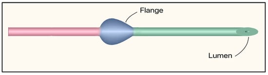 The implant is non-valved, made of medical-grade stainless steel, and MRI-compatible. With a total length of 2.44 mm, its shaft has an outer diameter of 400 μm and an inner lumen of 50 μm. The device is approved as a stand-alone treatment of glaucoma, and is inserted at the limbus (junction between the cornea and sclera) under a conjunctival flap (Figure 14) [35]. This initial approach resulted in severe complications such as persistent hypotony, inflammation, conjunctival erosion, suprachoroidal hemorrhage, endophthalmitis, and fibrosis. Later, the surgery was modified to cover the device with a partial-thickness scleral flap, and the complications decreased on par with the complications of a traditional trabeculectomy [35,36].