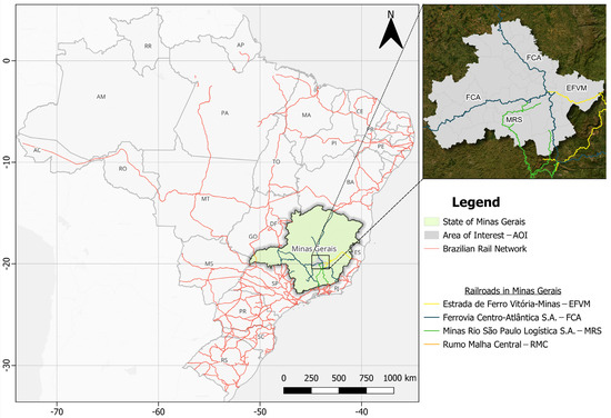 The state of Minas Gerais, where the area of interest of this study is located, is known for its leading role in the railroad sector in Brazil. The rail network in Minas Gerais is currently managed by four private concessionaires: Estrada de Ferro Vitória-Minas (EFVM), Ferrovia Centro Atlântica S.A (FCA), Minas Rio Logística S.A (MRS), and Rumo Malha Central (RMC). The total length is approximately 5000 km. According to the National Association of Brazilian Railroad Transporters (ANTF), rail transport accounts for 21.5% of the freight transport matrix in Brazil, while road transport predominates with 67.6%. The Brazilian rail network is only 30,810 km long, in contrast to the road network, which extends for approximately 1.7 million km. Minas Gerais stands out in this scenario due to its significant rail infrastructure, which is crucial for transporting commodities, consolidating the state as one of the country’s main rail transport hubs. The state of Minas Gerais is responsible for the largest volume of freight transported by rail in Brazil. In 2023 alone, 44% of the total useful tons were transported, which is equivalent to 235,000,972 tons of commodities [25,26,27,28]. Table 1 shows the main products transported on these railroads.