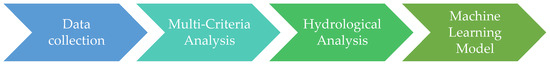 This study is organized into four main stages: data collection, multi-criteria analysis, hydrological modeling, and the application of machine learning algorithms for prediction. Figure 2 shows the flowchart of the steps described.