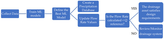 With the data collected and the information generated by the previous stages, these algorithms are trained to identify patterns and predict precipitation. By analyzing future rainfall volumes for the region, it will be possible to identify possible failures in the drainage assets. The proposed methodology consists of creating a database with future rainfall values, through which it will be possible to compare the flow values (calculated with current rainfall data) and thus assess whether the system remains safe, regardless of changes in the region’s rainfall pattern. This comparison will be performed in relation to the reference design flow, which is traditionally calculated in Brazil using the rational method.