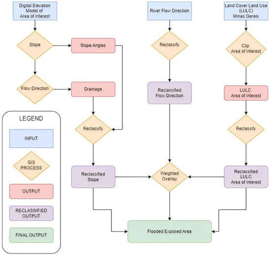 The image presented is a detailed flowchart of the analysis process used in this study, illustrating the various stages and tools applied. The flowchart begins with three sets of input data: a digital elevation model (DEM) of the area of interest, the river flow direction, and the land use and land cover (LULC) in Minas Gerais, all indicated in light blue boxes (input). From the DEM, two analyses are performed: slope and flow direction, which result in slope and drainage angles, respectively. Both results are reclassified, as indicated by the purple boxes (reclassified output). The river flow direction is reclassified directly, while the LULC data are first clipped to the area of interest and then reclassified. All reclassified data (slope, flow direction, and LULC) are then combined using the weighted overlay technique, represented by an orange diamond (GIS process). The final result of this process is the identification of flood-prone areas, indicated by a green box (final output). The legend to the left of the flowchart clarifies the function of each shape and color: inputs (light blue boxes), GIS processes (yellow diamonds), outputs (red boxes), reclassified outputs (purple boxes), and the final result (green box).