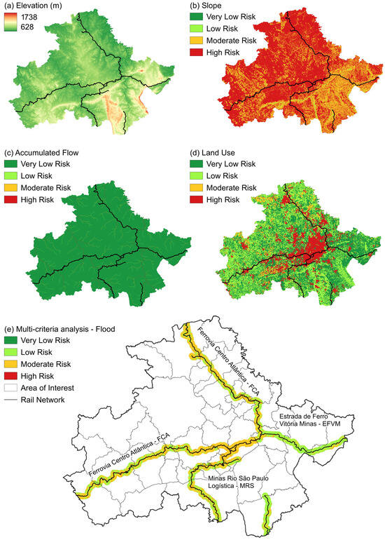 Current tools such as the random forest model [16,17] and advanced deep learning techniques [18,19] have produced highly accurate flood risk maps. These maps serve as critical tools for infrastructure management and decision-making [20]. The integration of geospatial and Earth observation data with MCA facilitates real-time and comprehensive flood risk assessment [21,22]. Successfully applied globally, these methods enhance infrastructure resilience against extreme weather [23,24]. Implementing similar methodologies in Minas Gerais can inform mitigation strategies adaptable to other regions. This study seeks to improve railroad infrastructure resilience in Minas Gerais, ensuring safety and reliability amid climate-related challenges. Employing ML, MCA, and geospatial tools will optimize decision-making and strategic planning in the context of ongoing climate change.