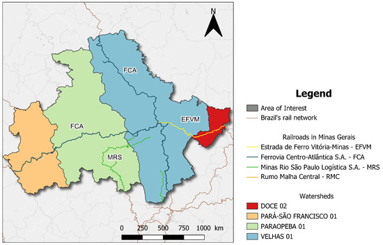 The study area consists of 38 municipalities in the state of Minas Gerais, totaling 10. 367.36 km2. The region is crossed by 447.54 km of operating railroads, 60.66 km of which is managed by Estrada de Ferro Vitória-Minas (EFVM), 276.21 km by Ferrovia Centro Atlântica S.A. (FCA), and 110.67 km by Minas Rio Logística S.A. (MRS) [29]. This area is representative of the state’s economic and geographical diversity, especially due to its intense mining and agricultural production, and its strategic role in the logistics of exporting mineral and agricultural commodities. Figure 1 depicts the area of interest in this study case.