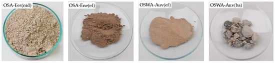 Macrophotographs of collected ash. Notation: Ash: OSA—oil shale ash, OSWA—oil shale + wood ash; power plants: Ees—Eesti, Ene—Enefit280, and Auv—Auvere; ash extraction method: nid—novel integrated desulfurizer, ef—electrostatic filters, ba—bottom ash.