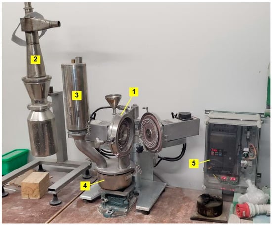 Laboratory-scale disintegrator Desi-11 for collision milling. Labeled parts: 1—disintegrator with an open milling chamber showing rotors and grinding disks; 2—vibro feeder with a hopper; 3—air filter; 4—receiving container; and 5—control board.